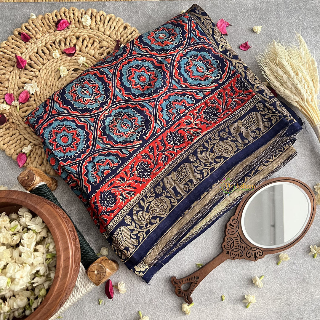 Colour and Material: Navy Blue Ajrakh Dola Silk Saree