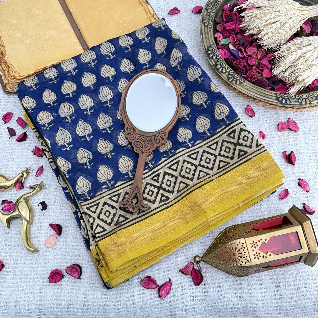 Exquisite Navy Blue Floral Print Maheshwari Cotton Silk Saree, meticulously handcrafted on traditional handlooms. This lightweight blend of cotton and silk offers exceptional breathability and a subtle sheen, making it the perfect choice for summer elegance. The distinctive leaf print pattern showcases artisanal craftsmanship while providing sophisticated comfort for both casual gatherings and formal occasions.