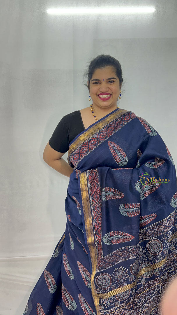 Elevate your collection with this Navy Blue & Leaf Design Maheshwari silk cotton saree, a sophisticated celebration of nature-inspired artistry. Expertly handwoven from premium silk-cotton blend, this saree features delicate leaf motifs gracefully adorning a deep navy blue canvas, creating an organic elegance that speaks to refined taste. The serene color palette paired with botanical detailing offers a contemporary sensibility while honoring traditional weaving techniques. The breathable, lightweight fabric provides exceptional comfort and drapes beautifully, allowing natural movement while maintaining impeccable structure. Each saree embodies the meticulous skill of master Maheshwari weavers, ensuring authenticity and quality in every thread. Perfect for those seeking handloom textiles that seamlessly blend artistic vision with timeless sophistication and cultural heritage.