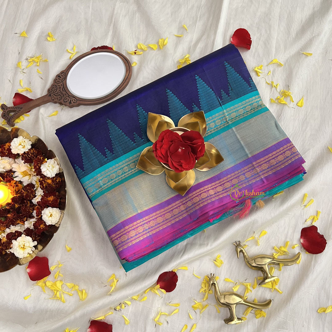 Indulge in the luxury of our Vriksham Navy Blue with Ganga Jamuna Border Silk Cotton Saree. Handcrafted with intricate details and a touch of exclusivity, this saree brings together the beauty of navy blue and the timeless elegance of silk cotton. Elevate your style with the Ganga Jamuna border and embrace the artistry of our saree.
