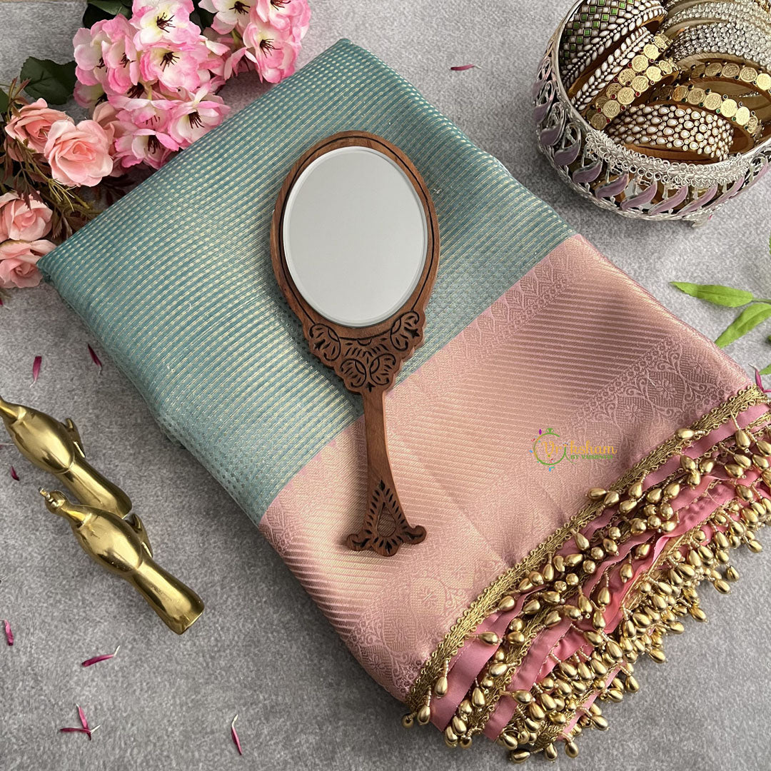 Embrace the ethereal beauty of this Vriksham Nayanthara inspired saree. Handloomed from sky blue and baby pink organza, the saree exudes luxurious elegance, complete with a delicate golden drop tassle. Indulge in this exclusive piece, inspired by the timeless grace of Nayanthara.