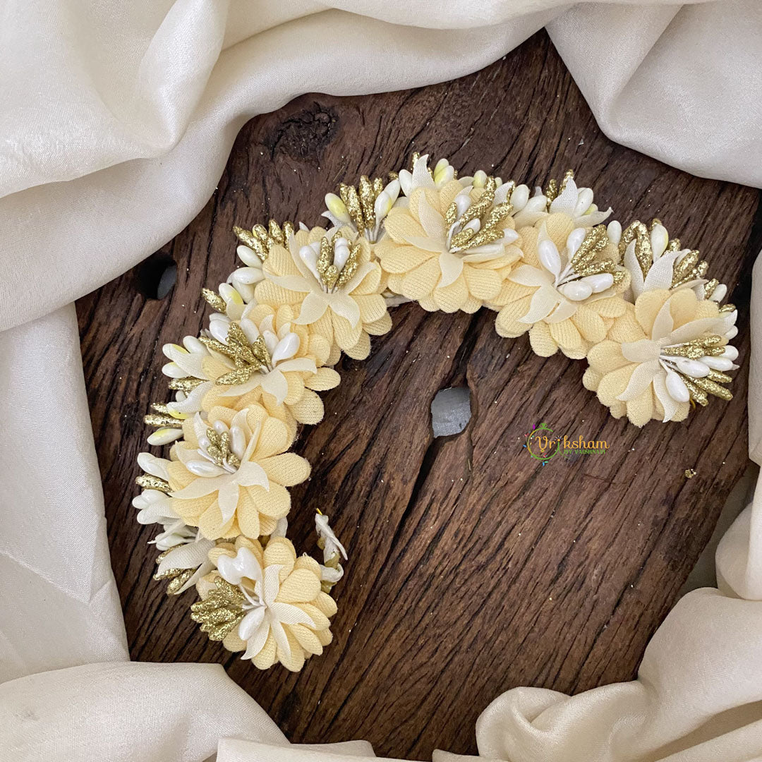 Elevate your look with the exquisite Vriksham Off White Floral With Beads Veni-Flower Accessory. The delicate yellow florals and intricate beading add a touch of sophistication and luxury to any outfit. Perfect for weddings, special occasions, or adding a touch of elegance to your daily style.
