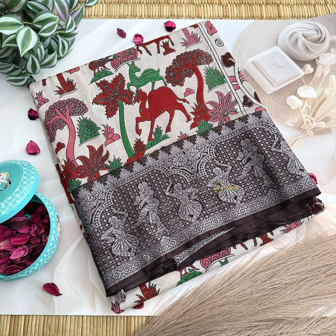 Vriksham Off White & Red Kalamkari Saree With Kanchi Border-VS4680