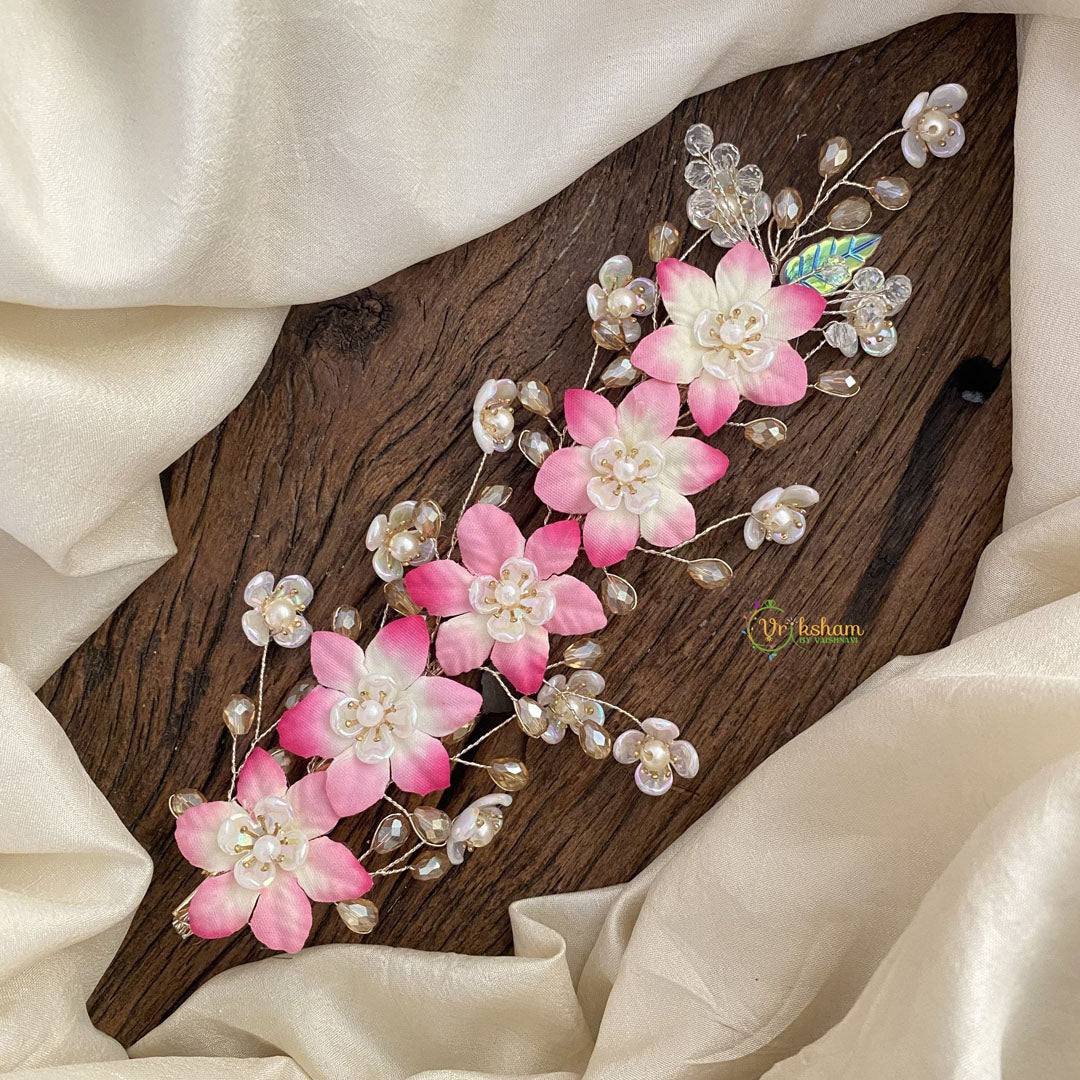 Get ready to elevate your bridal look with the Vriksham Off White with Light Pink Floral Bridal Hair Accessories. Featuring delicate floral details in a timeless off-white color, these hair accessories add a touch of sophistication and romance to any bridal hairstyle. Make a statement on your special day with Vriksham.