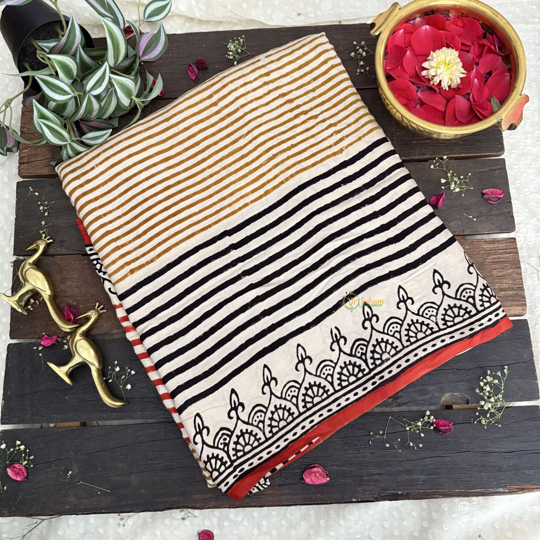 The Vriksham Off White With Multi Color Striped Print Ajrakh Modal Silk Saree features a subtle off-white base adorned with vibrant multi-colored stripes, showcasing exquisite Ajrakh craftsmanship on soft modal silk. Its elegant drape and lightweight texture make it perfect for sophisticated occasions, blending traditional artistry with contemporary charm.