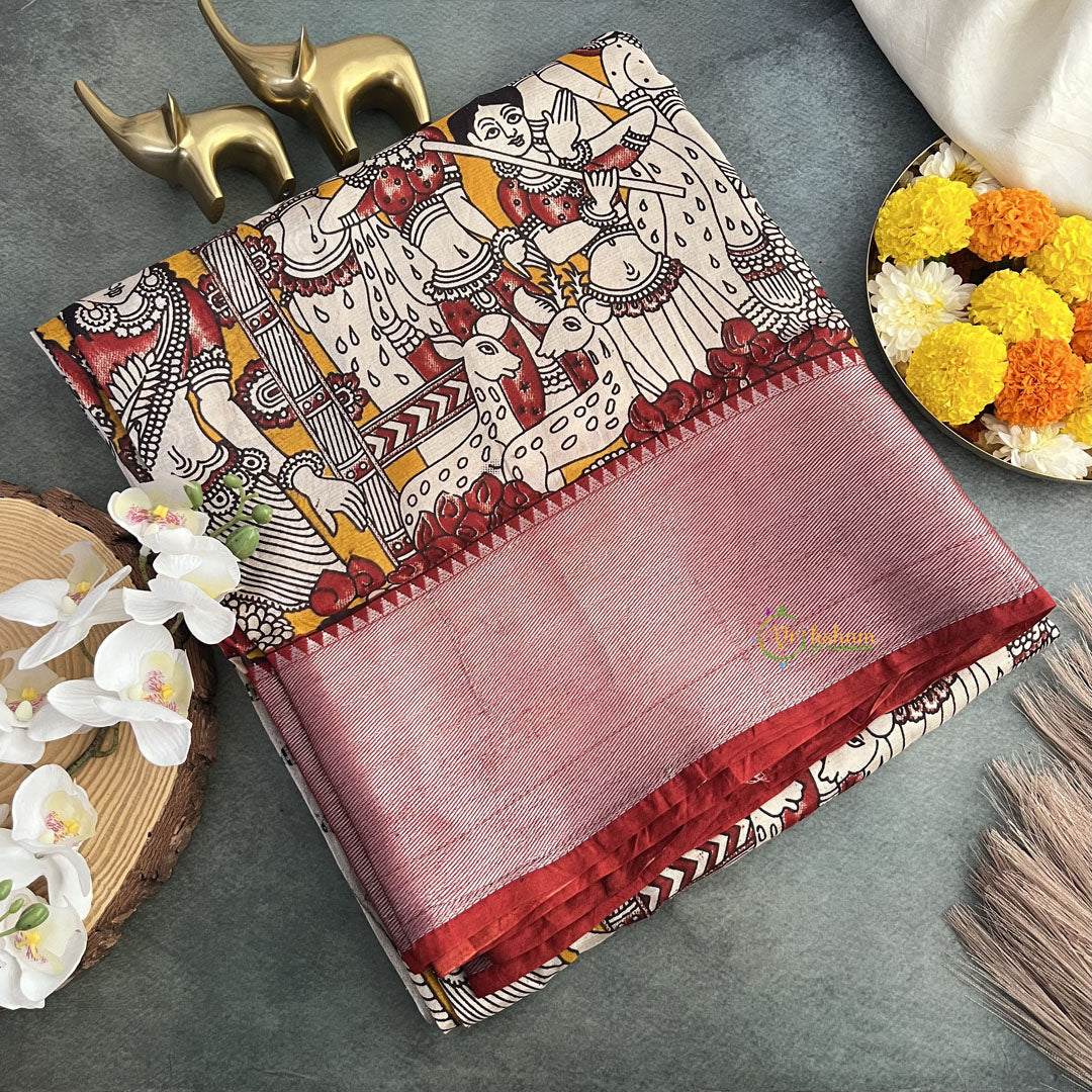 Vriksham Off White With Mustered Kalamkari Saree with Kanchi Border-VS4319