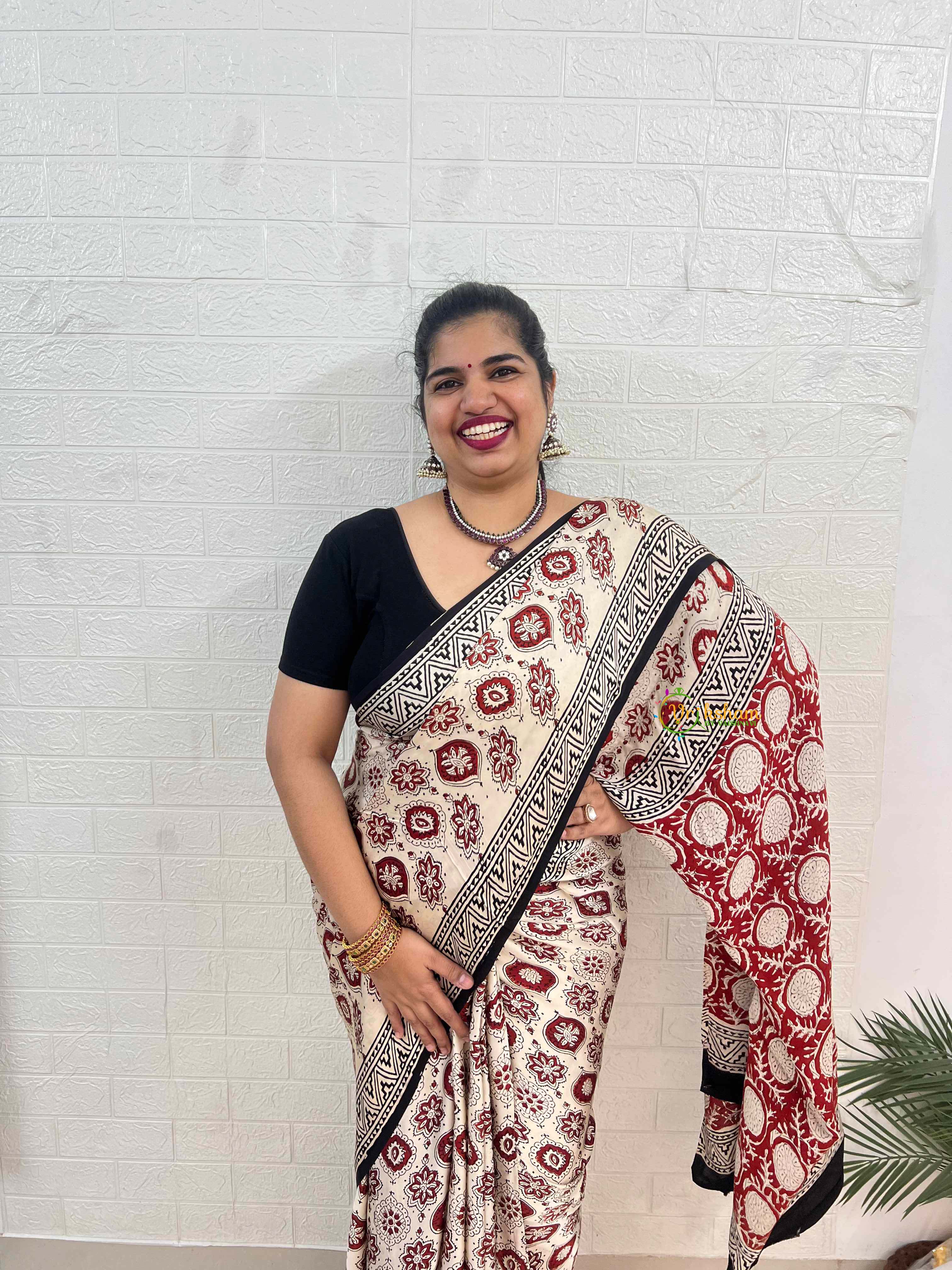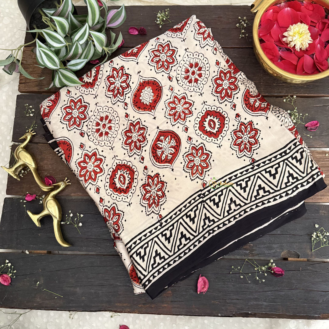 The Vriksham Off White With Red Floral Striped Print Ajrakh Modal Silk Saree features a serene off-white base adorned with elegant red floral stripes, crafted using traditional Ajrakh techniques on soft modal silk. Its smooth texture and graceful drape make it perfect for sophisticated occasions, blending timeless artistry with refined style.