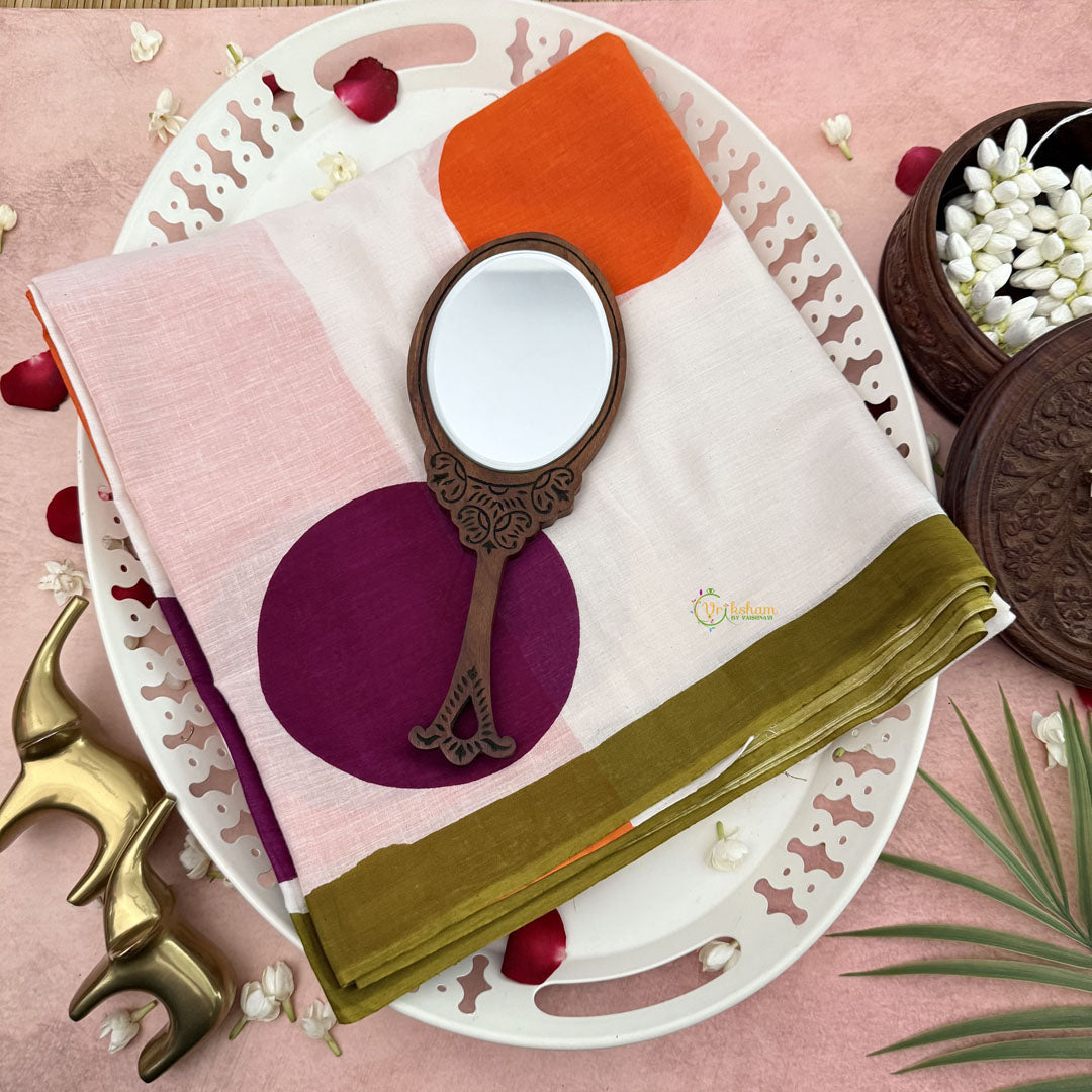 Elevate your wardrobe with the Vriksham Off White Cotton Mulmul Saree, adorned with elegant round prints that add subtle charm. Made from soft, breathable mulmul cotton, this saree ensures comfort while maintaining a graceful silhouette. Its understated design and light fabric make it perfect for both casual and formal occasions, offering a sophisticated look that blends tradition with contemporary style.