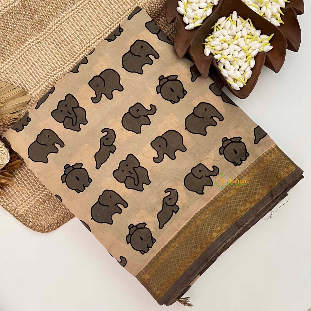 Experience understated luxury with this refined Kalamkari saree, featuring a serene off-white base complemented by elegant slate grey elephant motifs. Each design element is meticulously hand-painted using traditional Kalamkari techniques, honoring centuries of artisanal mastery. The sumptuous golden zari border elevates the composition with subtle opulence, creating a harmonious balance between minimalism and grandeur. Ideal for weddings, cultural events, and occasions demanding graceful sophistication, this saree offers versatile styling possibilities. A distinguished investment piece that celebrates India's textile artistry while providing the discerning wearer with a timeless garment that transcends fleeting trends and seasons.