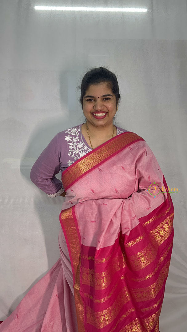 Indulge in graceful elegance with this captivating Kalyani cotton saree, featuring a soft onion pink base complemented by a delicate pink-green border and intricate butta embellishments. Crafted from premium Kalyani cotton, the fabric delivers exceptional comfort and breathability, ensuring effortless sophistication throughout the day. The subtle interplay between muted pink and soft sage-green creates a contemporary yet timeless aesthetic, perfect for weddings, celebrations, and refined occasions. The ornamental butta design reflects authentic Indian weaving heritage and adds textural dimension to the composition. Natural Kalyani cotton ensures superior drape, exceptional durability, and straightforward maintenance. This elegant piece appeals to the discerning woman who values understated beauty, cultural craftsmanship, and modern sensibilities—a versatile investment that seamlessly transitions across occasions with quiet confidence and enduring sophistication.