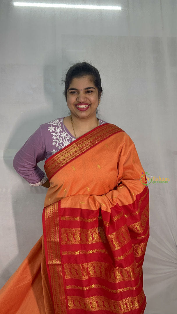 Radiate warmth and vitality in this stunning Kalyani cotton saree, featuring a vibrant orange fabric accented with a bold red border. The intricate butta design woven throughout the textile exemplifies traditional craftsmanship and artistic precision. Crafted from premium Kalyani cotton, this saree ensures superior comfort and breathability, making it an excellent choice for festive occasions, celebrations, and cultural events. The dynamic orange and red palette creates an eye-catching, energetic look that celebrates your vibrant personality. The fabric's natural drape gracefully enhances your form, while the detailed butta motifs add texture and visual richness. Perfect for those seeking authentic heritage wear with contemporary appeal, this saree is a versatile wardrobe essential that brings joy and elegance to every occasion.