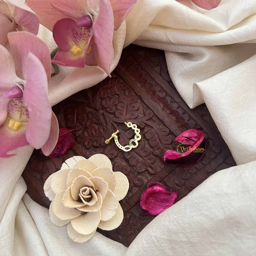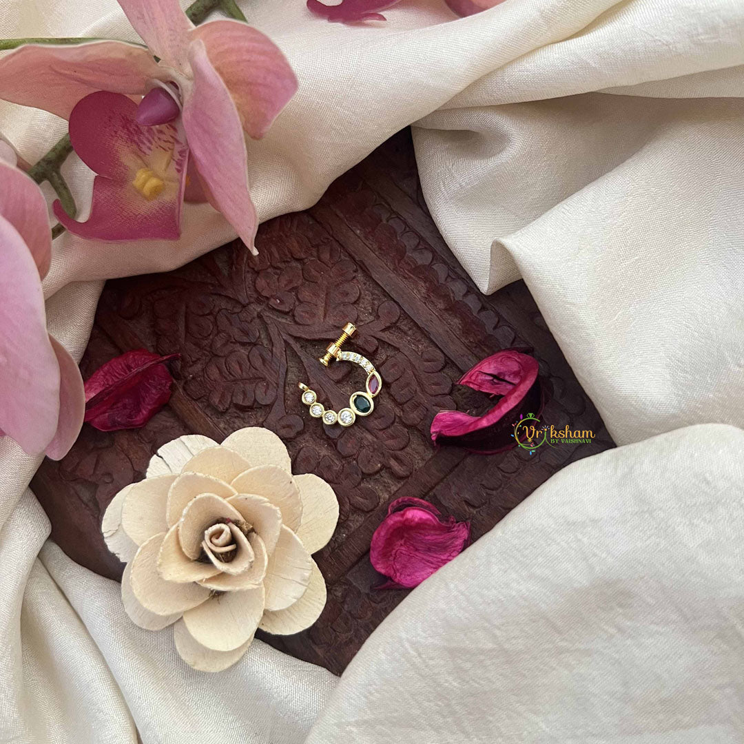 The Vriksham Oval & Dot Style Press Naths in red, white, and green features a graceful oval design complemented by delicate dot accents. Designed for a secure and comfortable press fit, this nose pin combines classic shapes with vibrant colors to add a sophisticated touch to both traditional and contemporary ensembles.