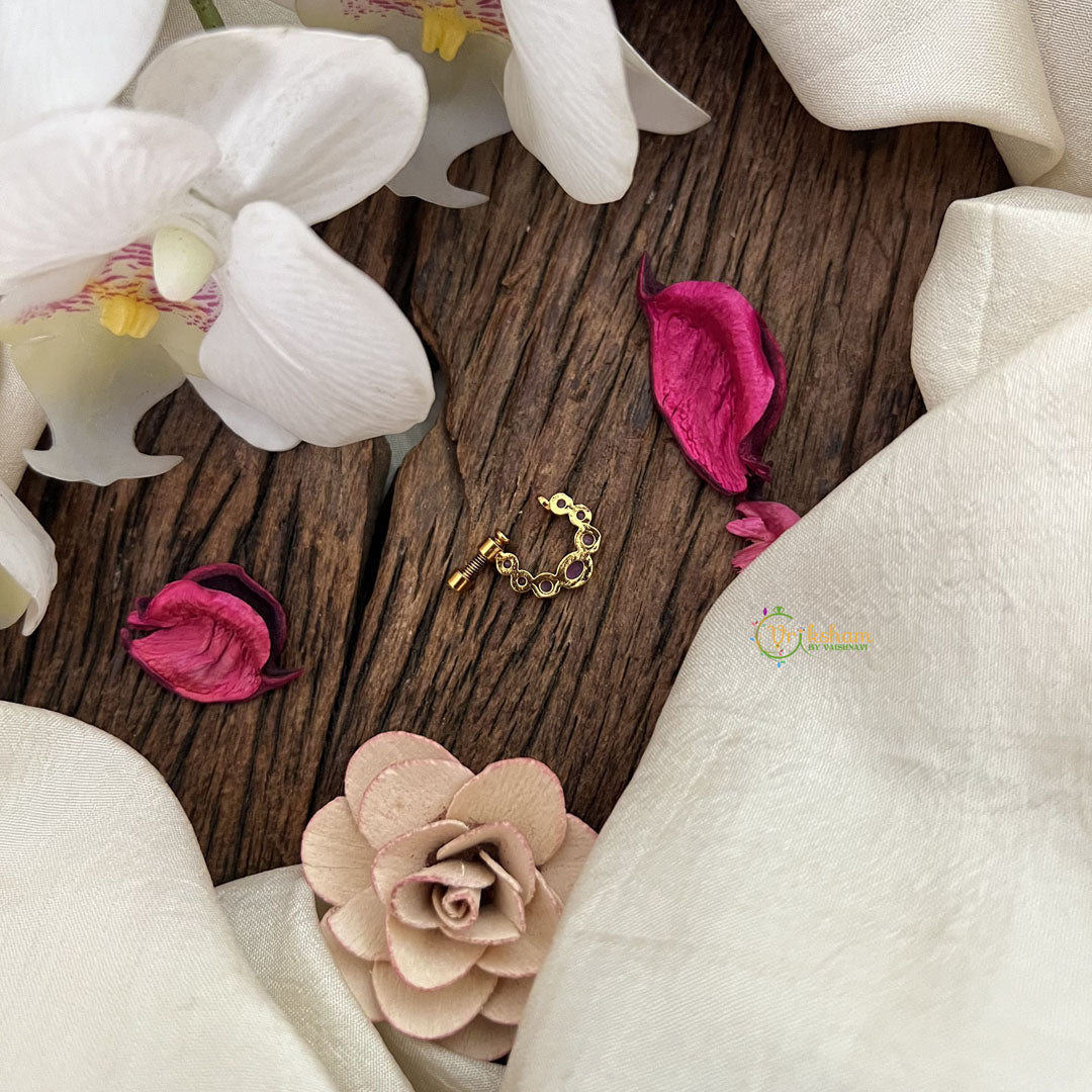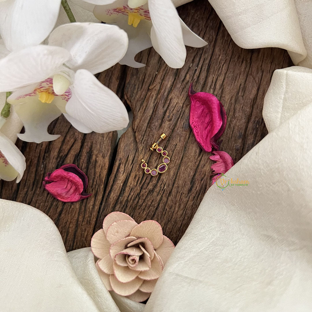 The Vriksham Oval Round Style Naths features a harmonious blend of red hues in an elegant oval-round design. This meticulously crafted nose pin combines classic shapes with refined detailing, offering a sophisticated accessory that adds timeless beauty and subtle elegance to any ensemble.