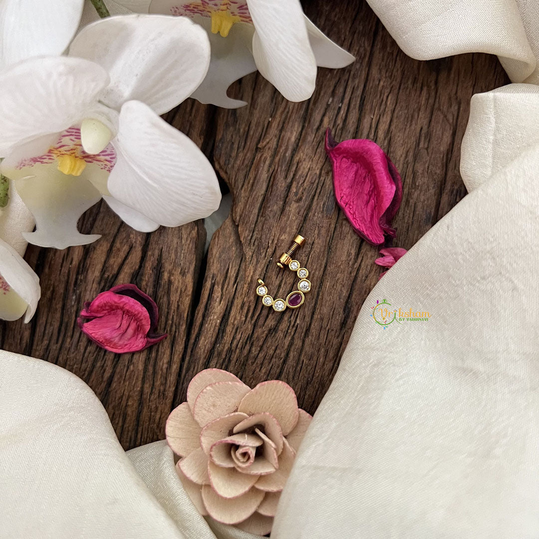 The Vriksham Oval Round Style Naths features a harmonious blend of red and white hues in an elegant oval-round design. This meticulously crafted nose pin combines classic shapes with refined detailing, offering a sophisticated accessory that adds timeless beauty and subtle elegance to any ensemble.