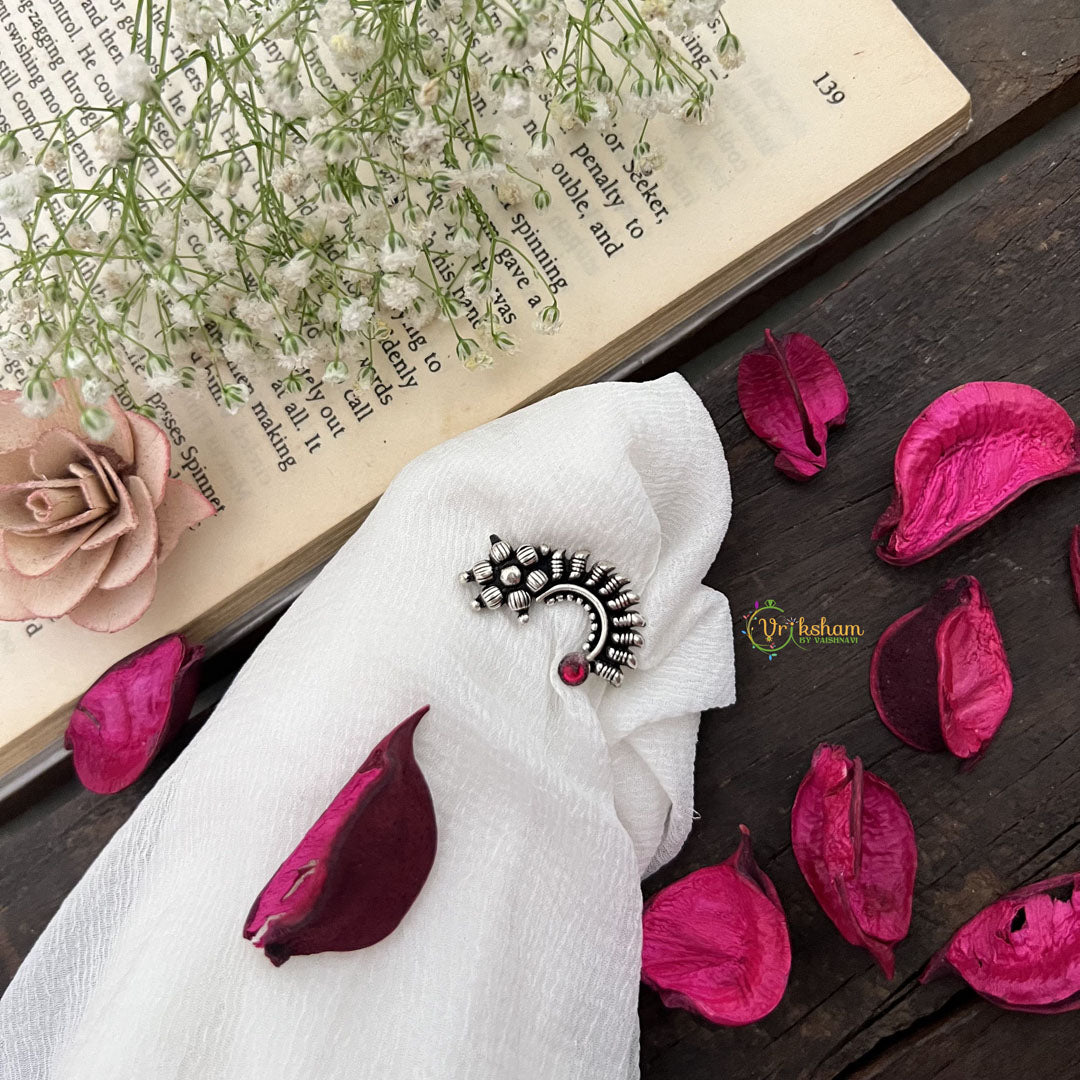 The Vriksham Oxidized Designer Star Nose Ring features a sleek star motif crafted in oxidized silver, delivering a subtle yet captivating statement. This pierced nath combines contemporary design with traditional materials, offering a sophisticated accessory that adds refined charm to any ensemble.