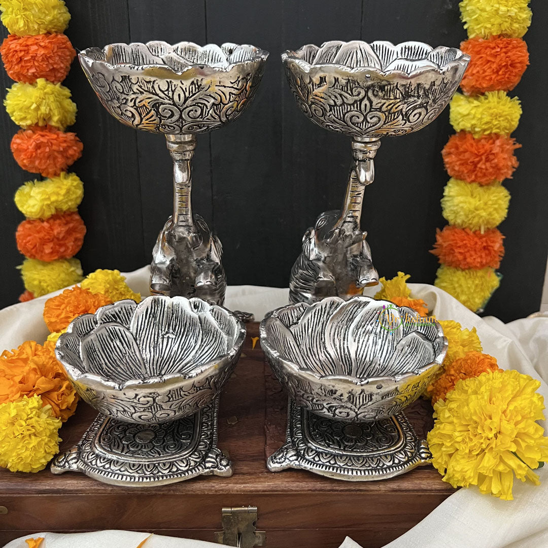 Enhance your Varalakshmi Pooja with this elegant set of two oxidized elephant figurines, each holding traditional bowls. Crafted with intricate detailing, these decor pieces blend cultural symbolism with timeless artistry, making them perfect for sacred rituals or as thoughtful gifts. Their antique finish adds a sophisticated touch to your festive arrangements, embodying prosperity and grace.