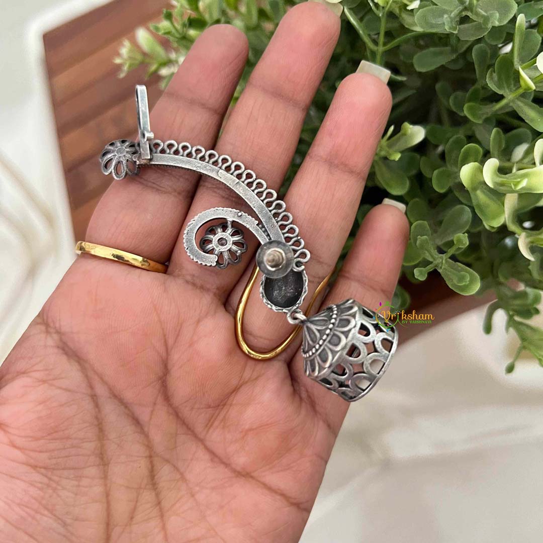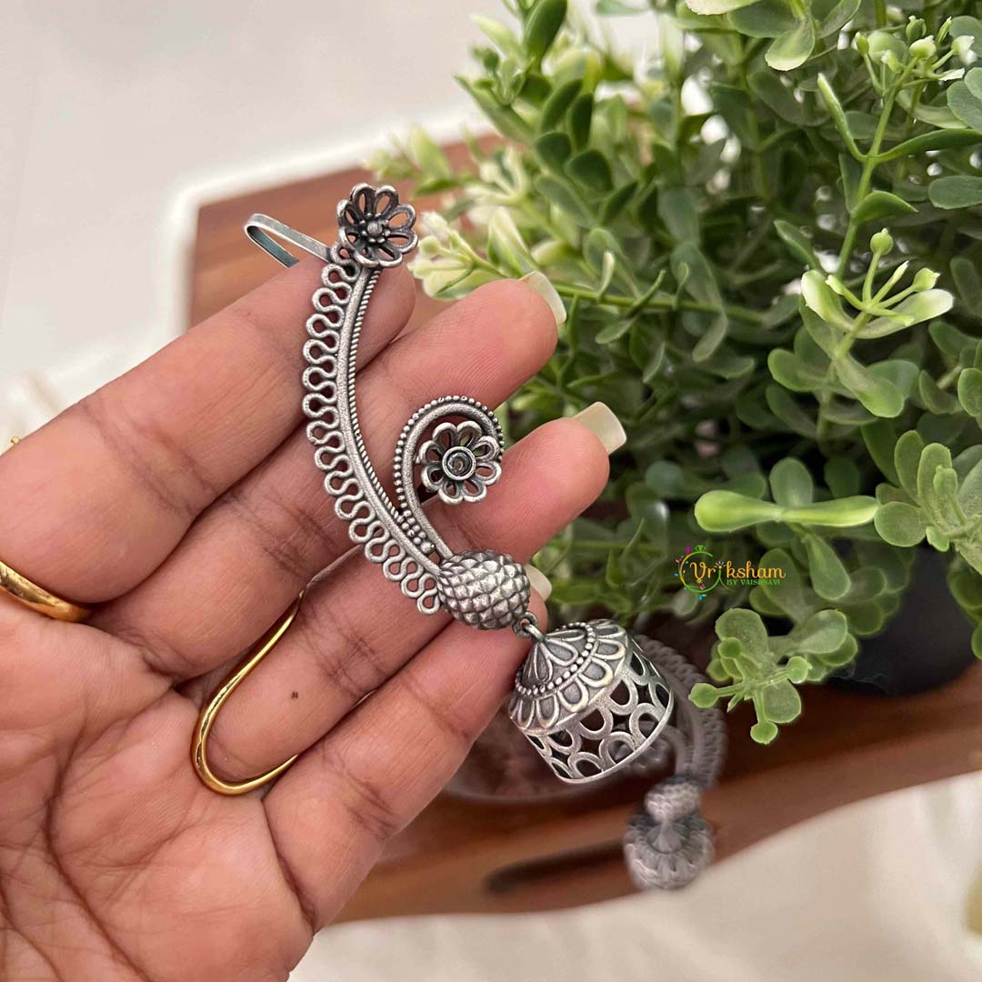 Elevate your jewelry collection with these refined oxidized silver floral ear-cuff jhumkas, featuring pristine white accents that radiate elegance. The antique silver patina creates a distinguished backdrop for delicate floral motifs, while pearl or crystal white elements add luminous sophistication. The secure ear-cuff design ensures graceful wear throughout your day, whether attending weddings, festivals, or upscale gatherings. These timeless pieces embody the perfect balance of heritage craftsmanship and modern sensibility, offering versatile styling options for those who favor understated glamour and classic Indian jewelry aesthetics.
