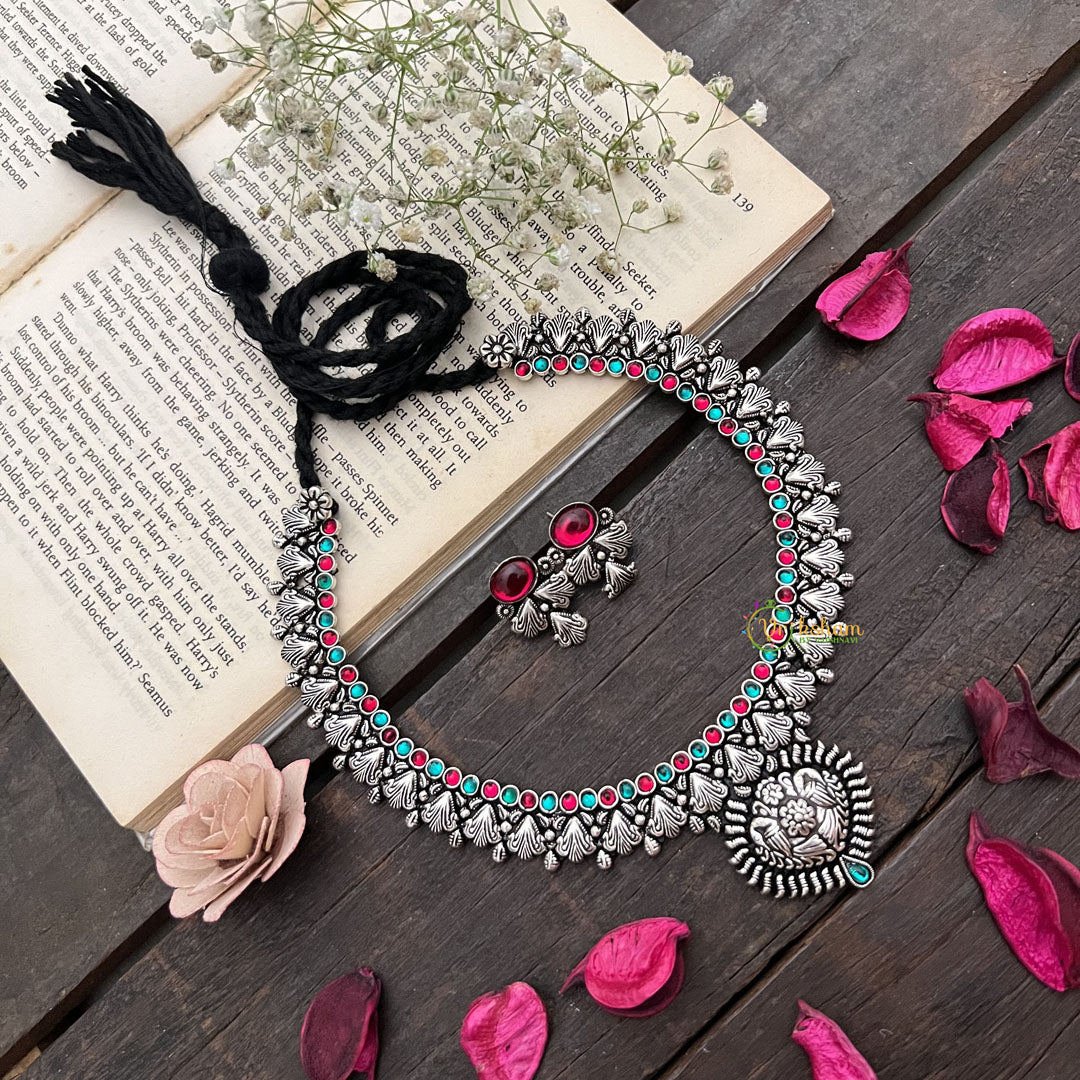 The Vriksham Oxidized Silver Floral Pendant Neckpiece in red and green beautifully combines intricate floral artistry with a vibrant color palette. Crafted from oxidized silver, this piece offers a refined, vintage appeal that enhances both traditional and contemporary looks. Its subtle elegance and rich hues make it an ideal choice to elevate any ensemble with sophistication.