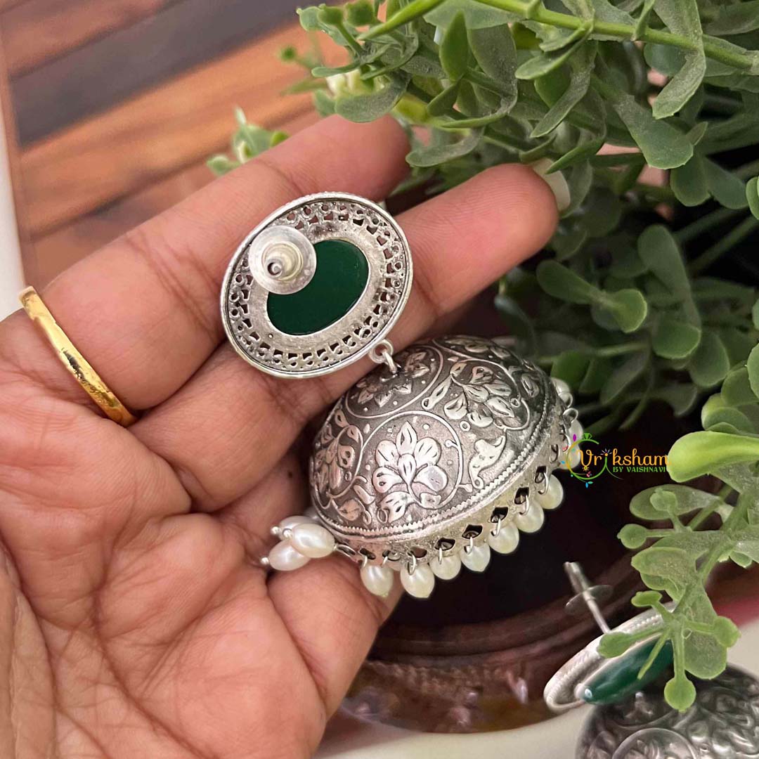 Embrace understated elegance with these oxidized silver jhumkas, featuring verdant green onyx studs paired with pristine white pearl accents. The jewel-toned gemstones evoke natural beauty and timeless appeal, while the weathered silver patina adds vintage character. Each piece is thoughtfully designed to harmonize traditional craftsmanship with modern sensibilities. Perfect for weddings, festivals, or refined everyday wear, these earrings make a subtle yet confident statement. The interplay between the deep green stones and luminous pearls creates visual depth and sophistication. A distinguished choice for those who value quality artistry and enduring style.