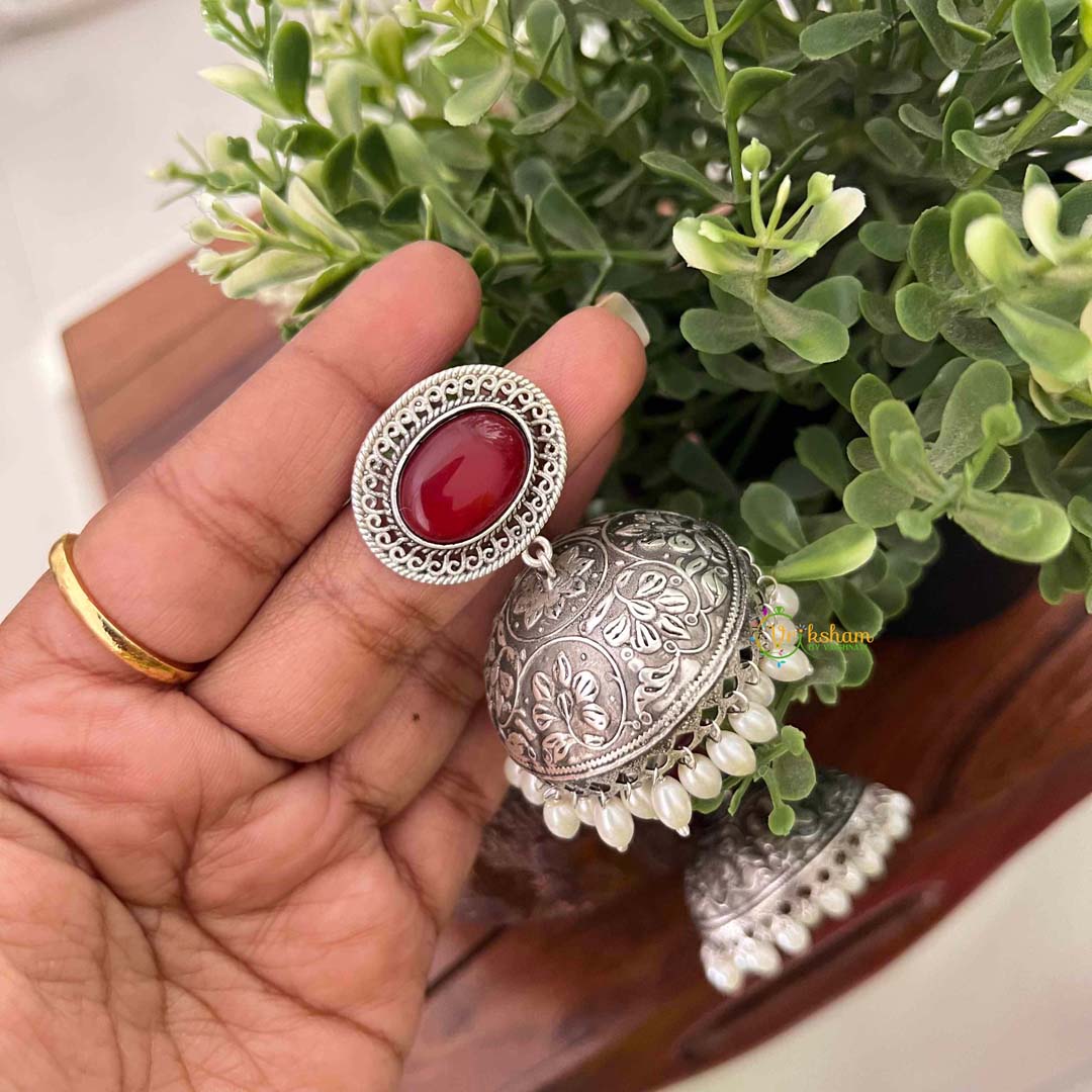 Discover the perfect balance of boldness and grace with these oxidized silver jhumkas, adorned with rich red onyx studs and luminous white pearl drops. The deep crimson gemstones create a striking contrast against the antique silver finish, while delicate pearls add an ethereal touch. Meticulously crafted for those who appreciate refined aesthetics, these earrings transition seamlessly from festive celebrations to special occasions. The oxidized patina enhances their vintage allure, making them a timeless investment piece. Whether paired with traditional attire or contemporary wear, these jhumkas radiate understated luxury and artistic sophistication.
