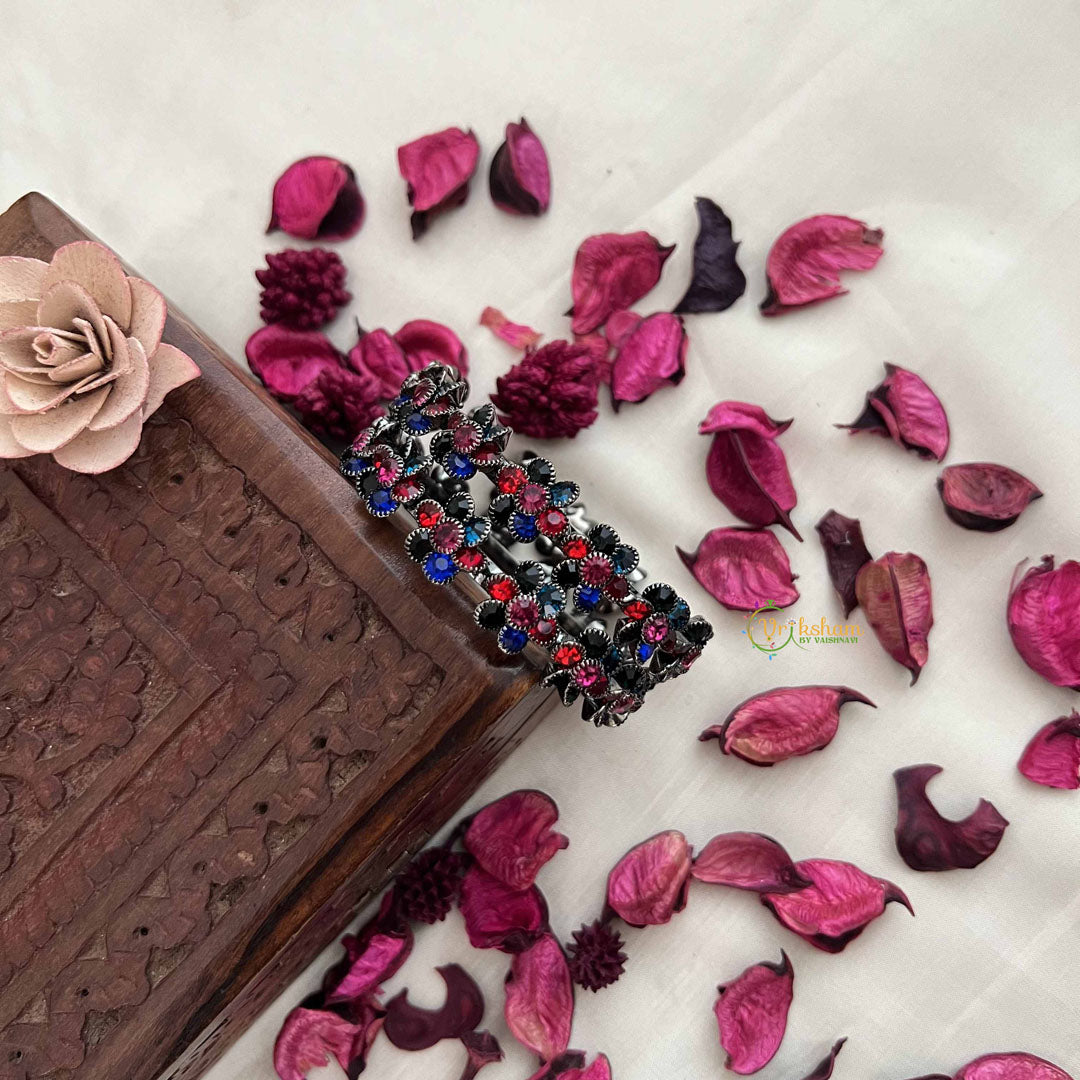 Elevate your elegance with the Vriksham Oxidized Silver Floral Bangles, delicately adorned with vibrant multicolor stones. These intricately crafted bangles combine traditional artistry with a contemporary flair, making them a perfect accessory for both festive occasions and everyday sophistication. Their oxidized finish adds a timeless charm while the colorful stones bring a subtle yet striking contrast, enhancing your style effortlessly.
