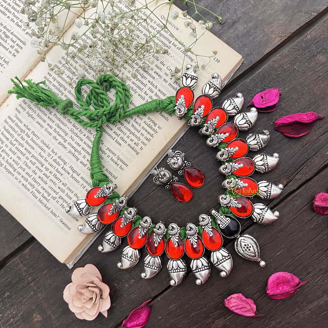Embrace timeless elegance with the Vriksham Oxidized Silver piece, adorned with striking red enamel and intricate Ganesha motifs. This sophisticated design combines traditional craftsmanship with contemporary style, making it an exquisite accessory that symbolizes wisdom and protection. Perfect for adding a refined touch to any ensemble.