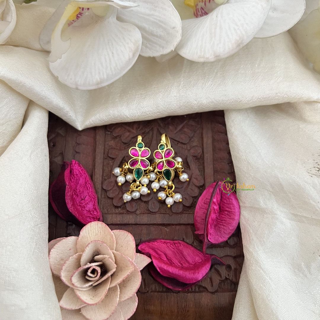 The Vriksham Paisley Floral Charm Kundan Jadau Press Bugadi in red green, accented with pearls, features an elegant fusion of paisley and floral motifs crafted with intricate kundan and jadau artistry. This sophisticated accessory adds a timeless and graceful touch to traditional attire, perfect for elevating your look on special occasions with refined elegance.