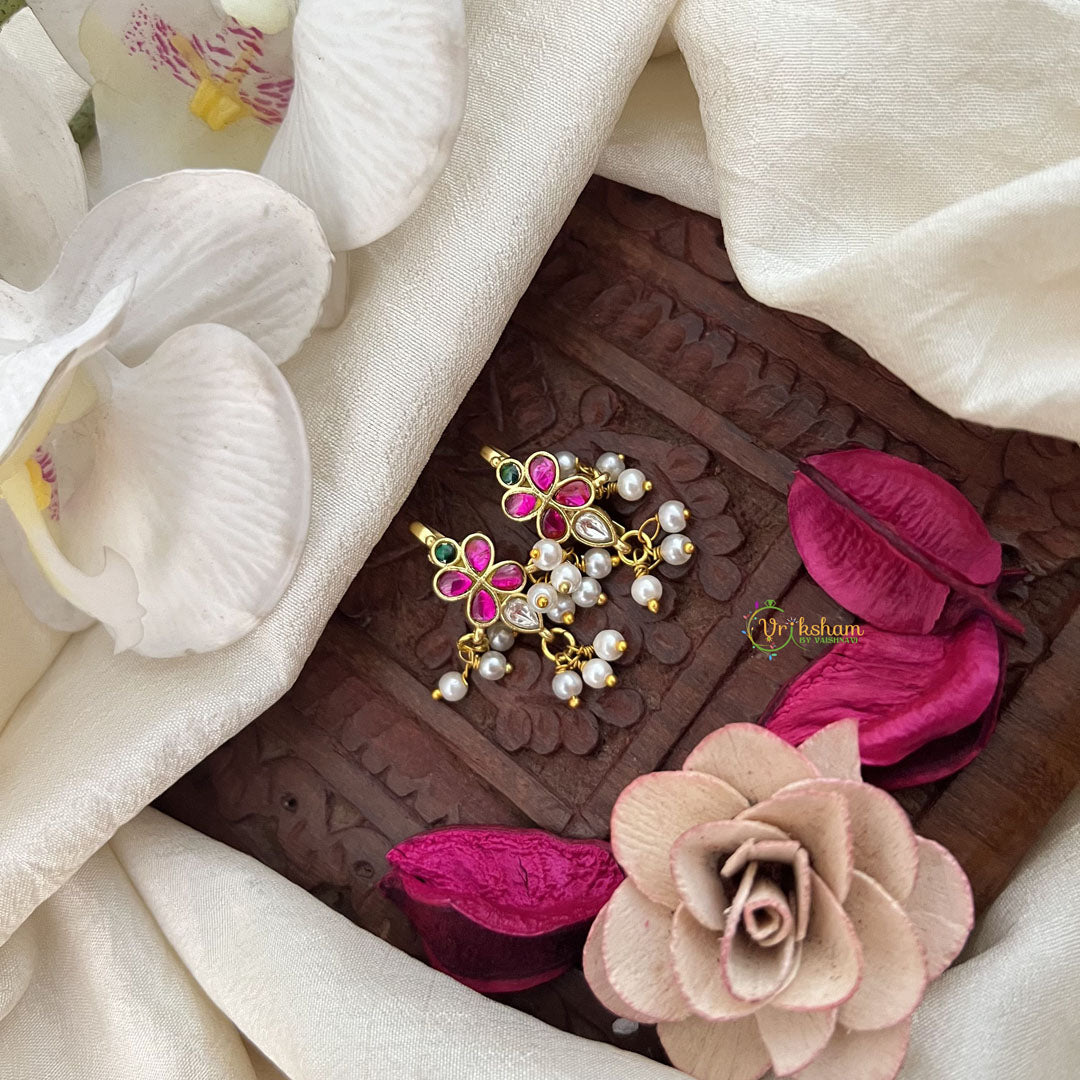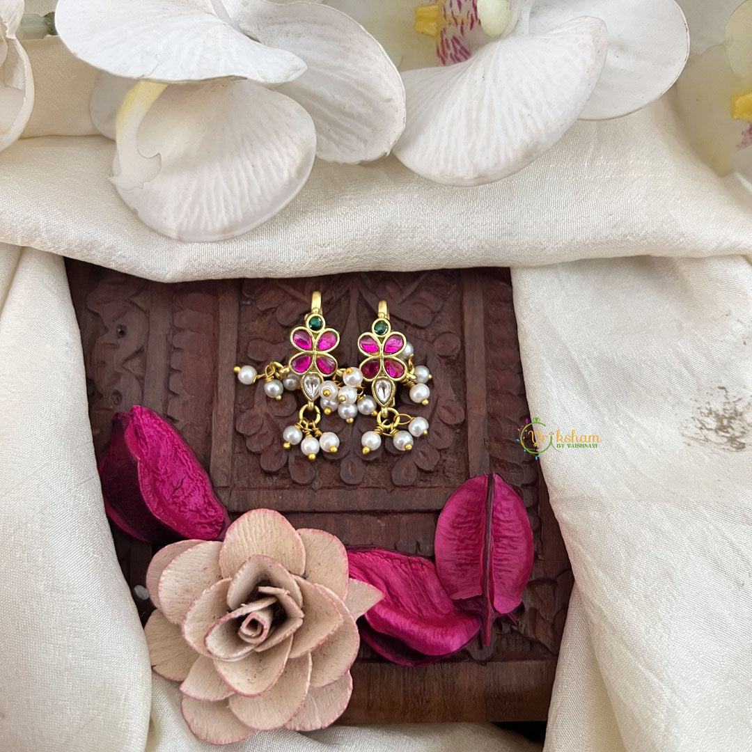 The Vriksham Paisley Floral Charm Kundan Jadau Press Bugadi in red, white, and green, accented with pearls, features an elegant fusion of paisley and floral motifs crafted with intricate kundan and jadau artistry. This sophisticated accessory adds a timeless and graceful touch to traditional attire, perfect for elevating your look on special occasions with refined elegance.