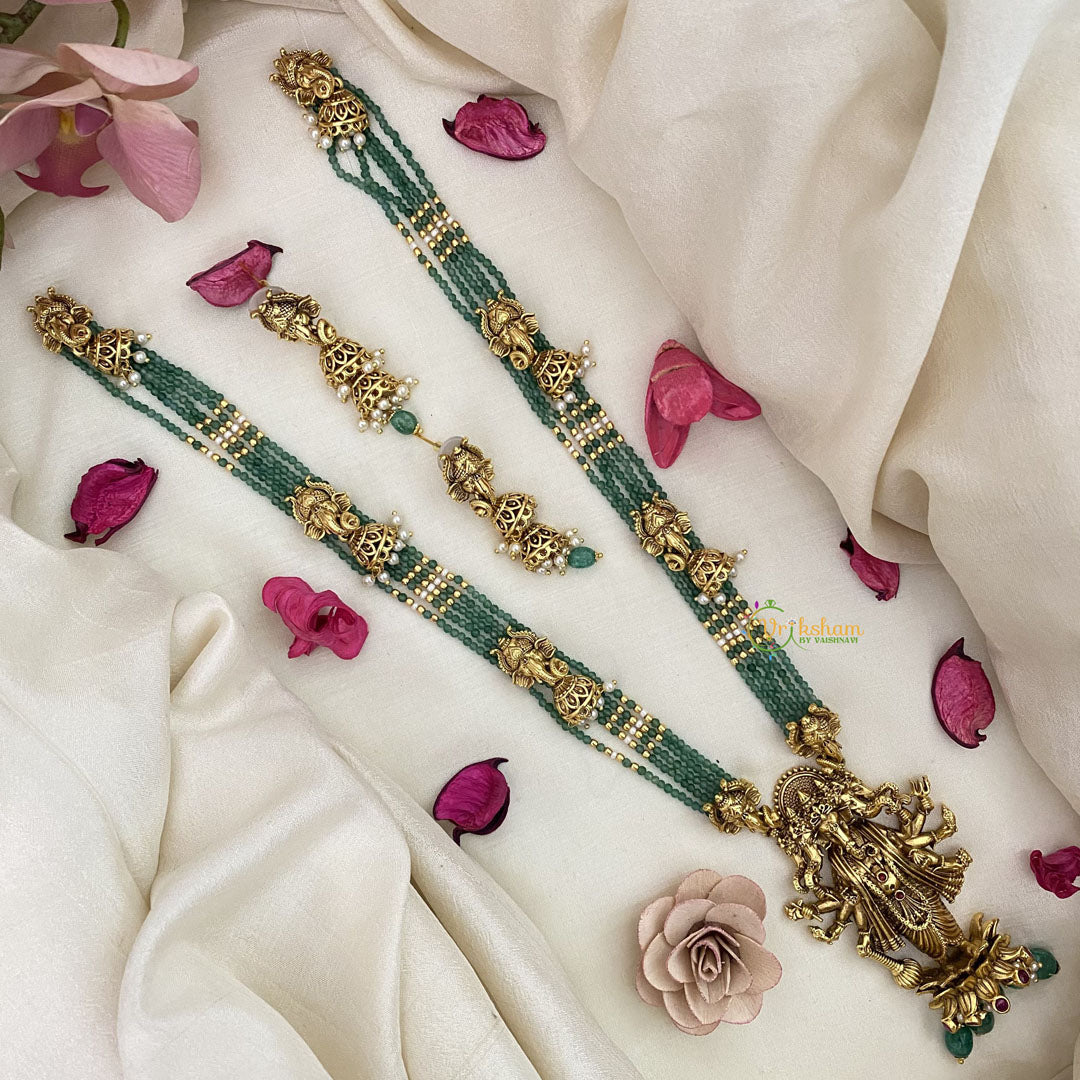 Indulge in the elegance and exclusivity of our Vriksham Panchamukhi Ganesha Pendant Pastel Green Beaded Layered Neckpiece. The intricate pendant, featuring five faces of the divine Ganesha, is adorned with delicate pastel green beads. Complete your luxurious look with this statement piece.
