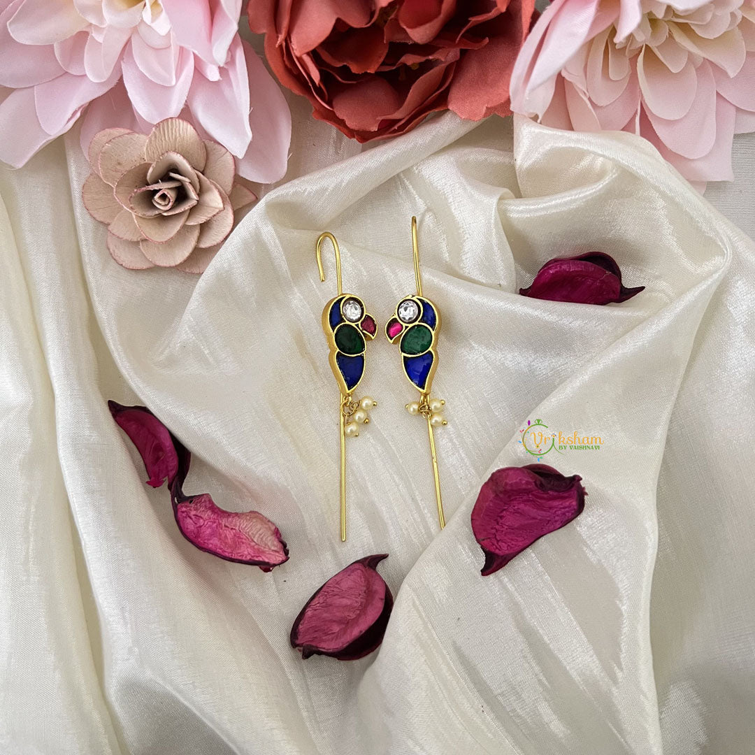 Exquisite parrot-motif Bugadi earrings featuring a sophisticated composition of red, green, and blue tones. Elegantly embellished with luminous pearls, these refined accessories blend avian-inspired artistry with traditional Bugadi heritage. The meticulous craftsmanship exemplifies Vriksham's dedication to elevated aesthetics, creating a distinguished adornment that conveys cultural appreciation through its nuanced design and impeccable execution.