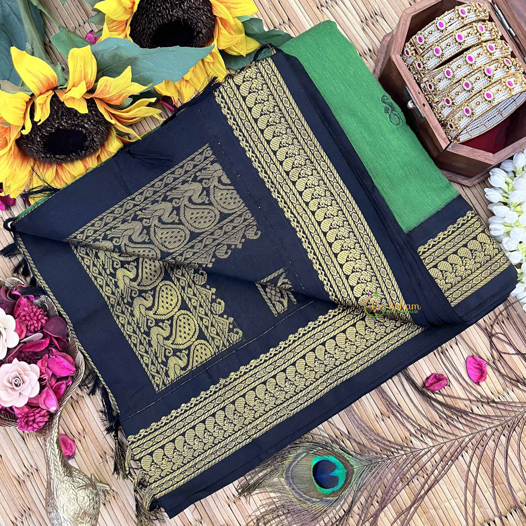 Make a bold statement with this striking Kalyani cotton saree, showcasing a vibrant parrot green body complemented by a dramatic black border and intricate butta embellishments. Crafted from premium Kalyani cotton, the fabric delivers superior comfort and breathability, ideal for all-day wear and warm weather. The striking color contrast creates a powerful visual impact while maintaining sophisticated appeal, perfect for festive celebrations, weddings, and special occasions. The traditional butta design reflects authentic Indian weaving heritage and adds textural depth to the composition. Natural Kalyani cotton ensures excellent drape, exceptional durability, and easy care. This commanding piece combines cultural authenticity with contemporary flair, offering a versatile wardrobe essential for the confident, style-conscious wearer.