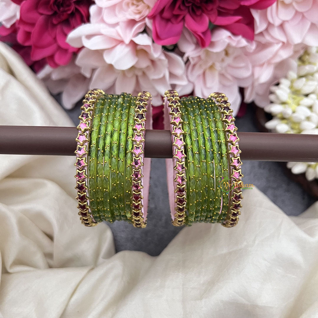 Vriksham Parrot Green Glass Bangles with Pink Star Border Bangle Set-G19846