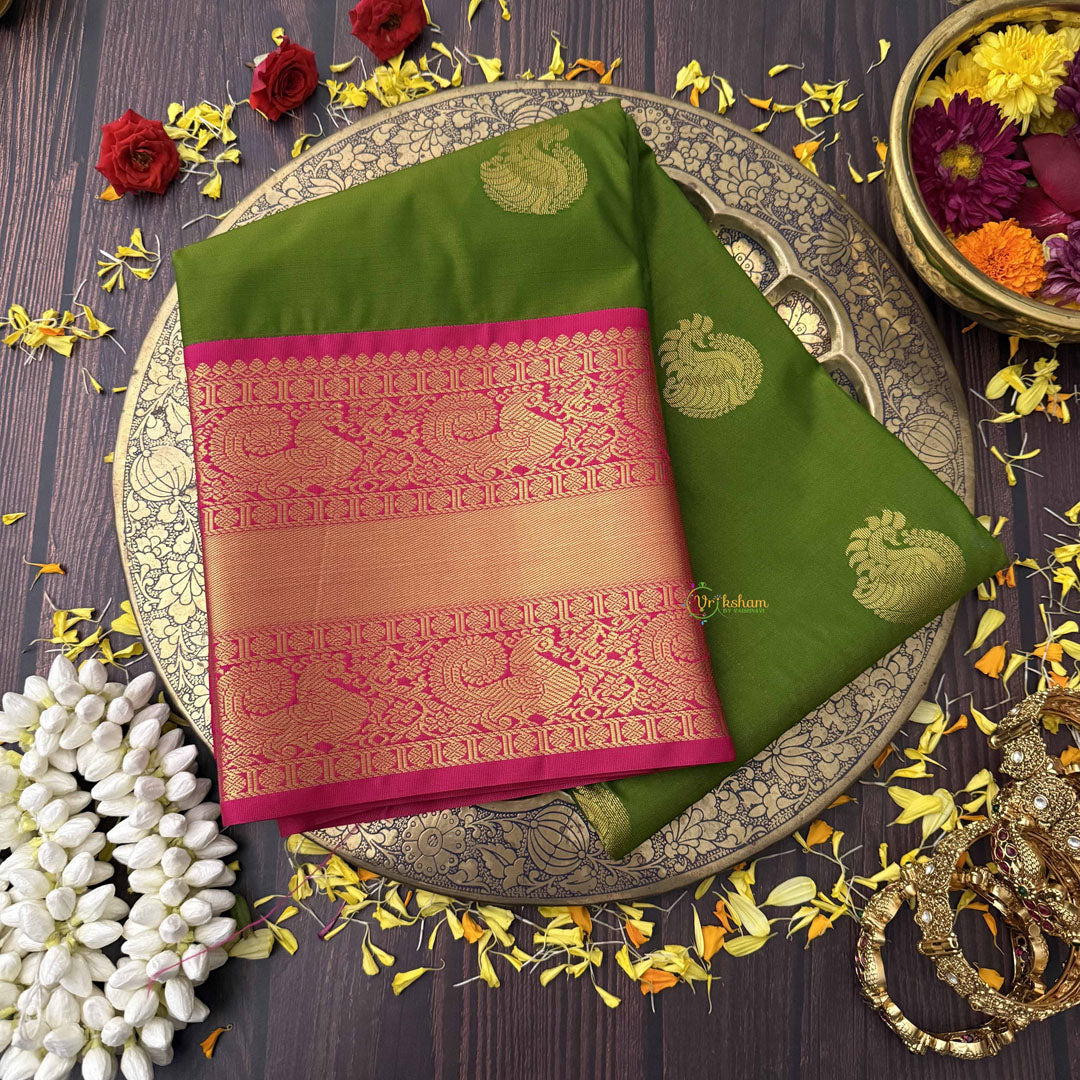 The Vriksham Parrot Green Kanchi Silk Saree captivates with its vibrant parrot green shade, richly adorned with elegant gold butta motifs. The contrasting Veldhaari pink zari border adds a delicate yet striking touch, enhancing the saree’s sophisticated appeal. Crafted from premium silk, it drapes beautifully, making it an ideal choice for refined celebrations and traditional events that celebrate timeless elegance.