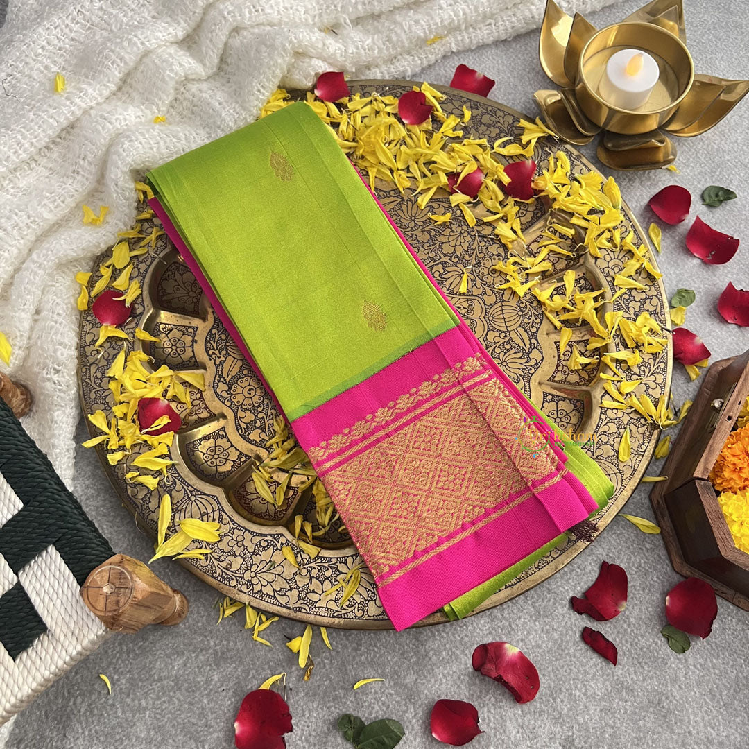 Elevate your style with our Vriksham Parrot Green and Rani Pink Korvai Thiribhuvanam Silk Saree. Made with pure silk, this saree exudes luxury and sophistication. The vibrant colors and unique weaving technique make this saree a true work of art. Stand out in any occasion with this exclusive piece.