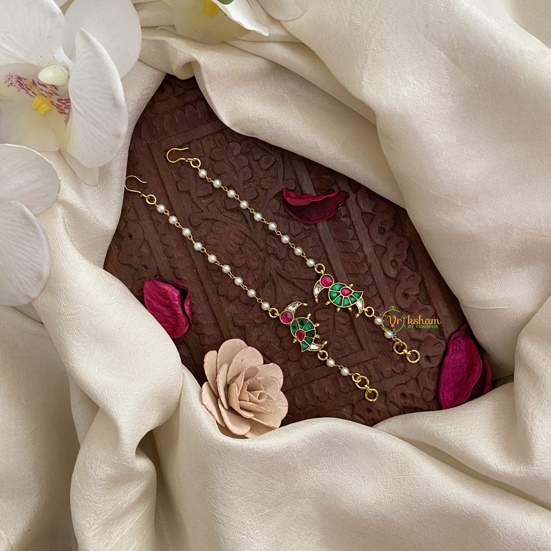 Elevate your style with Vriksham's Parrot Red White & Green Stone Single Strand White Pearl Maatil necklace. Each handcrafted piece features vibrant stones and lustrous pearls, adding a touch of luxury to any ensemble. Stand out from the crowd with this exclusive, sophisticated design.