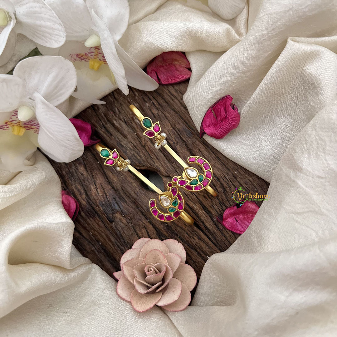 Elevate your elegance with the Vriksham Peacock Bloom Kundan Jadau Ear Cuffs adorned with pearls in rich red, green, and white hues. Crafted with intricate Kundan Jadau artistry, these ear cuffs blend traditional craftsmanship with contemporary style, offering a graceful statement piece perfect for special occasions. The delicate pearl accents add a touch of sophistication and timeless charm to your ensemble.