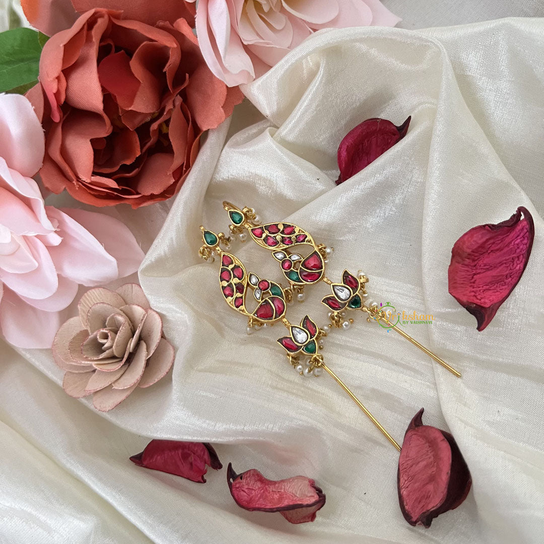 Majestic peacock-inspired Bugadi earrings featuring an exquisite interplay of red, green, and white hues. Embellished with lustrous pearls, these statement pieces capture the regal essence of India's national bird while honoring traditional Bugadi craftsmanship. Each meticulous detail reflects Vriksham's commitment to artistic excellence, offering a refined accessory that commands admiration with understated elegance.