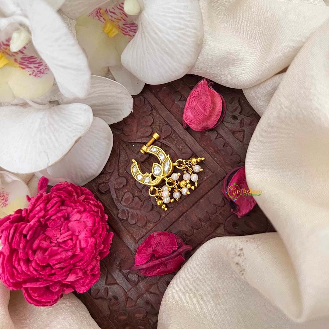 Adorn yourself with this magnificent peacock-style kundan jadau press nath, a symbol of elegance and divine beauty. Showcasing luminous green, red, and white kundan stones intricately set in the revered peacock motif, this nose pin exemplifies masterful traditional craftsmanship. The peacock design evokes grace and prosperity, while the harmonious blend of jewel tones creates a captivating visual presence. The convenient press-on mechanism ensures comfortable wear without piercing, making it ideal for special occasions or daily adornment. Perfect for those who appreciate cultural authenticity and exceptional artisanal quality, this nath elevates your facial features with timeless sophistication and honors the rich heritage of Indian jewelry design.