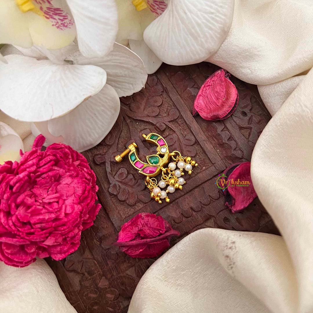 Vriksham Peacock Father Green Red & White Reversible Kundan Jadau Press Naths/Nose Pin-Pearls-J4098