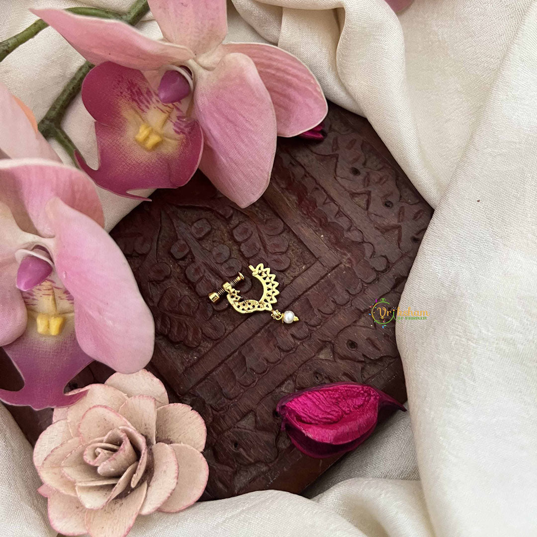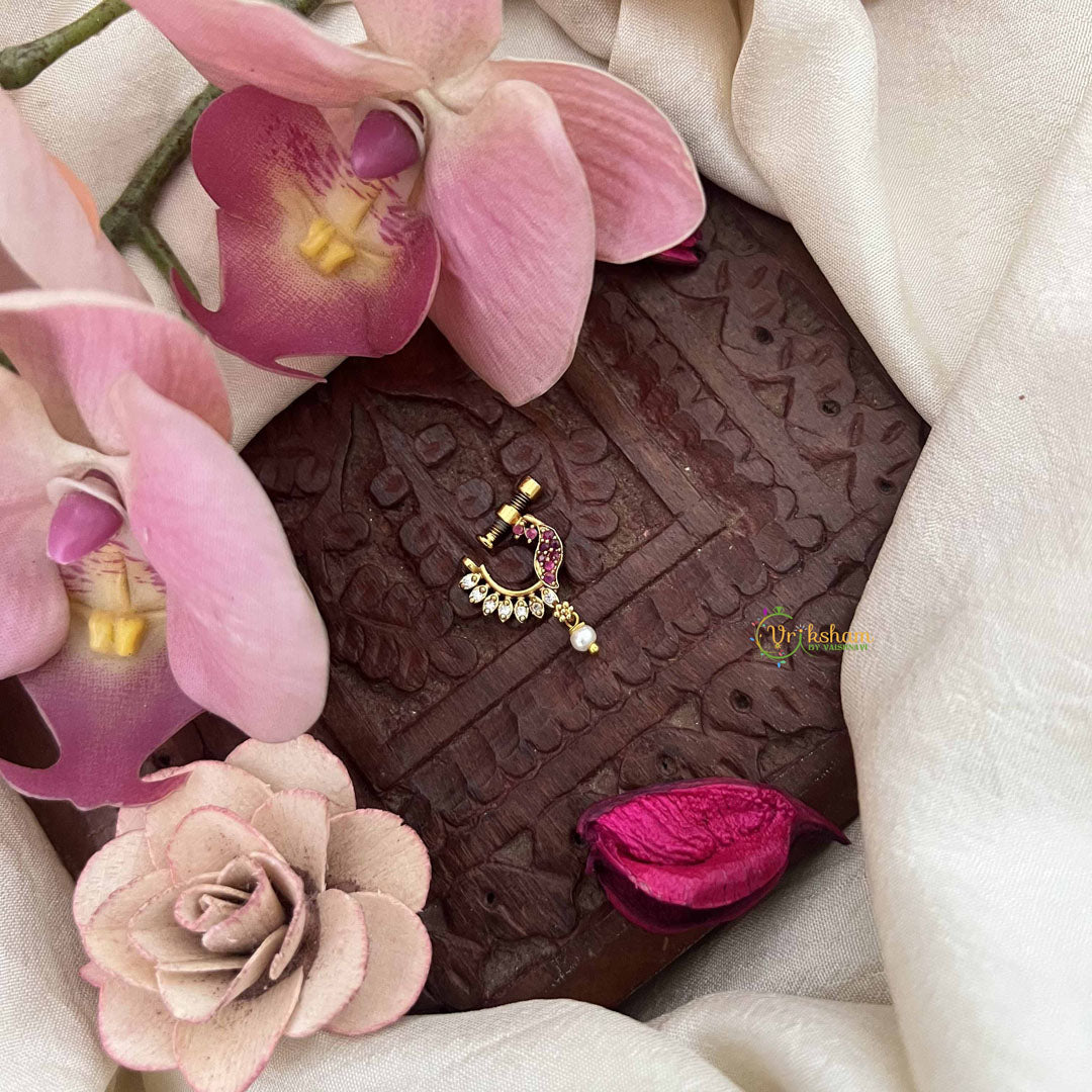 The Vriksham Peacock Father Style Press Nose Pin in red and white features intricate peacock-inspired motifs complemented by elegant pearl drop accents. Designed with a convenient press-fit mechanism, this sophisticated piece adds a refined touch of tradition and grace to any ensemble.