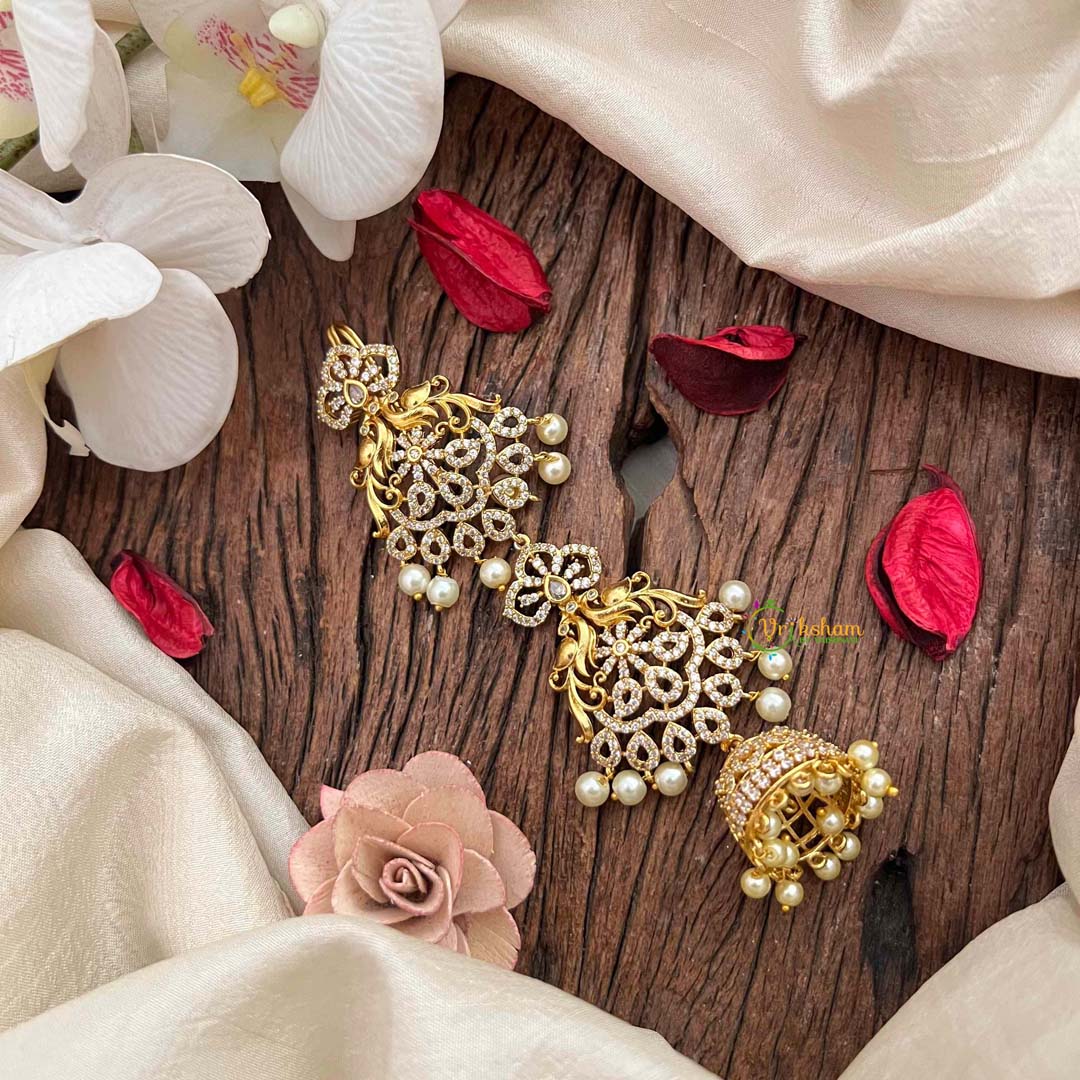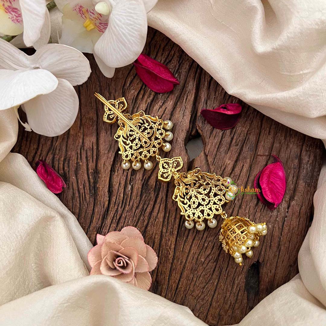 Celebrate nature's splendor with this Peacock Feather AD Stone Gold Touch With Jhumka Drops Jad Billai, an enchanting piece that captures the iridescent beauty of peacock plumage. Adorned with sparkling AD stones that mimic precious gems and kissed with warm gold tones, this accessory radiates opulence and refinement. The graceful jhumka drops embellished with lustrous pearls add movement and dimension, creating an ethereal elegance. Perfect for those who appreciate symbolic artistry and sophisticated design, this exquisite creation transforms any occasion into a moment of divine beauty, blending mythological reverence with contemporary glamour.