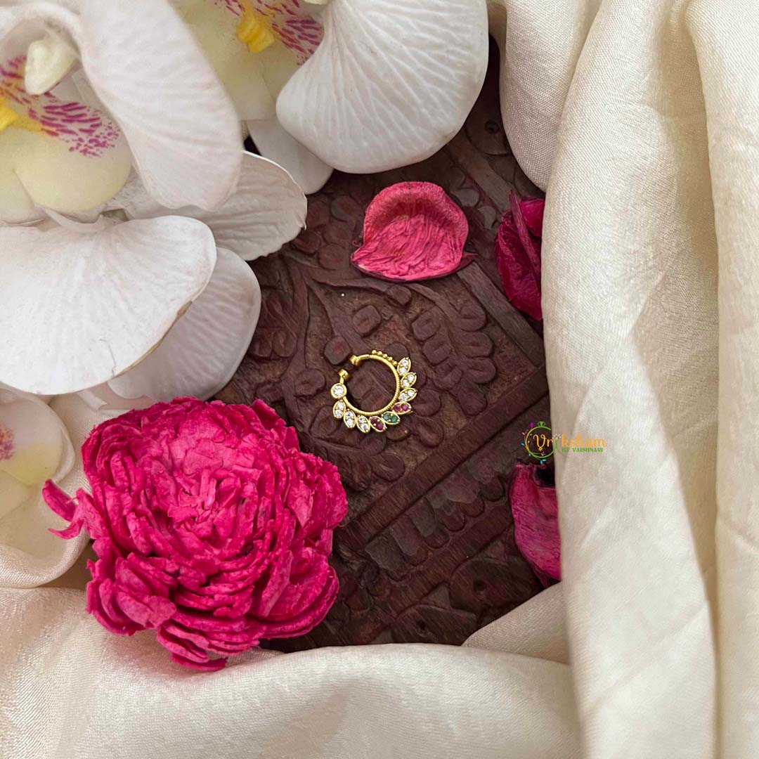 Indulge in the splendor of this peacock feather gold-plated septum ring, a breathtaking celebration of Indian bridal magnificence. The ornate feather motif is beautifully embellished with a harmonious blend of red, white, and green AD stones, evoking the natural majesty of peacock plumage. The warm gold plating enhances the design's luxurious appeal, while exceptional artisanal craftsmanship ensures every detail resonates with refinement. Ideal for weddings, festive occasions, and milestone celebrations, this sophisticated piece brings unparalleled elegance and cultural authenticity to your bridal ensemble. A distinguished treasure that honors heritage artistry and timeless beauty.