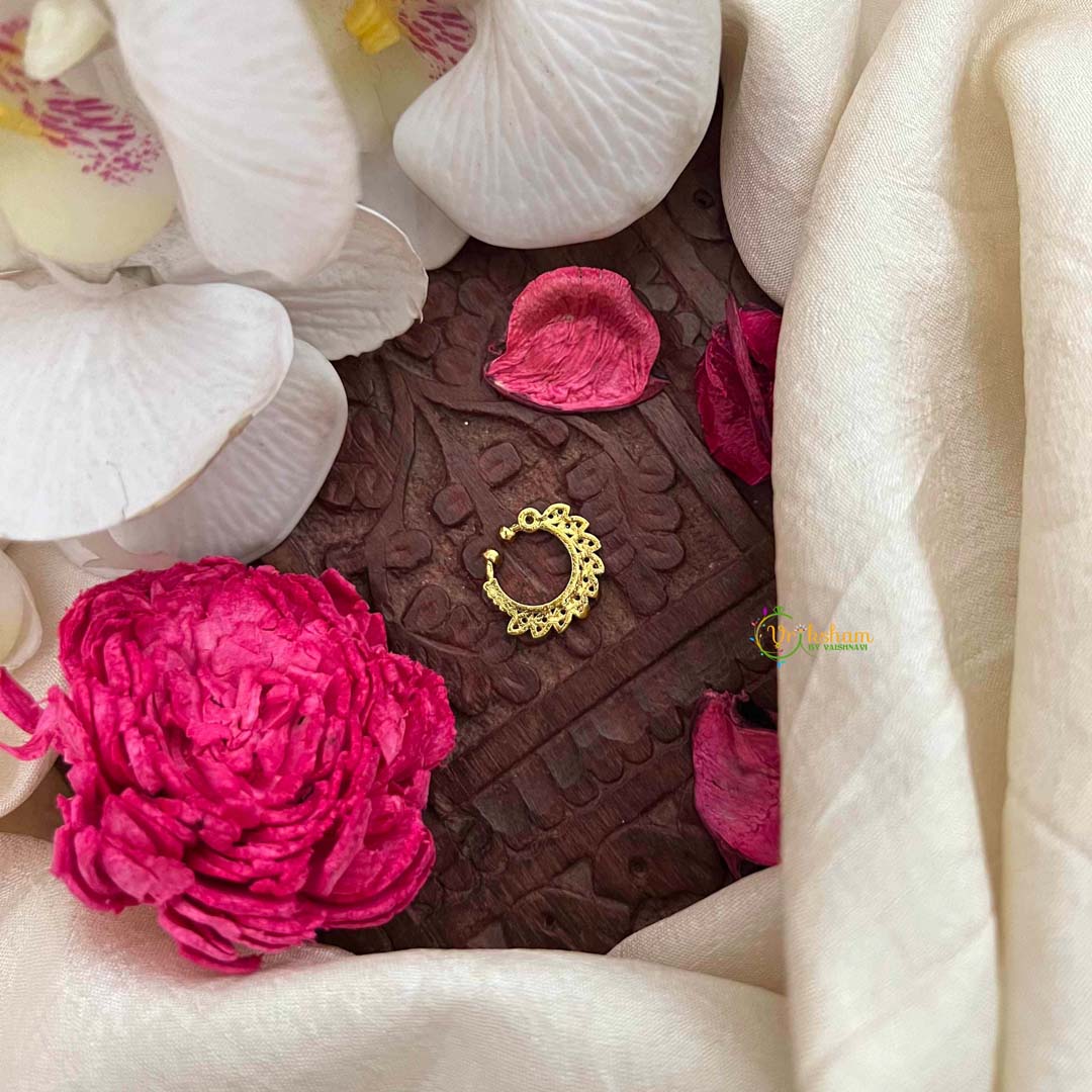 Golden Naths/Nose ring for Non - Pierced Nose. People who do not have piercing do not have to worry about not being able to wear naths. These nose rings helps people with non pierced nose also wear the same with a screw like holding. The moment you see the nath you will be able to understand how it will sit on the nose.