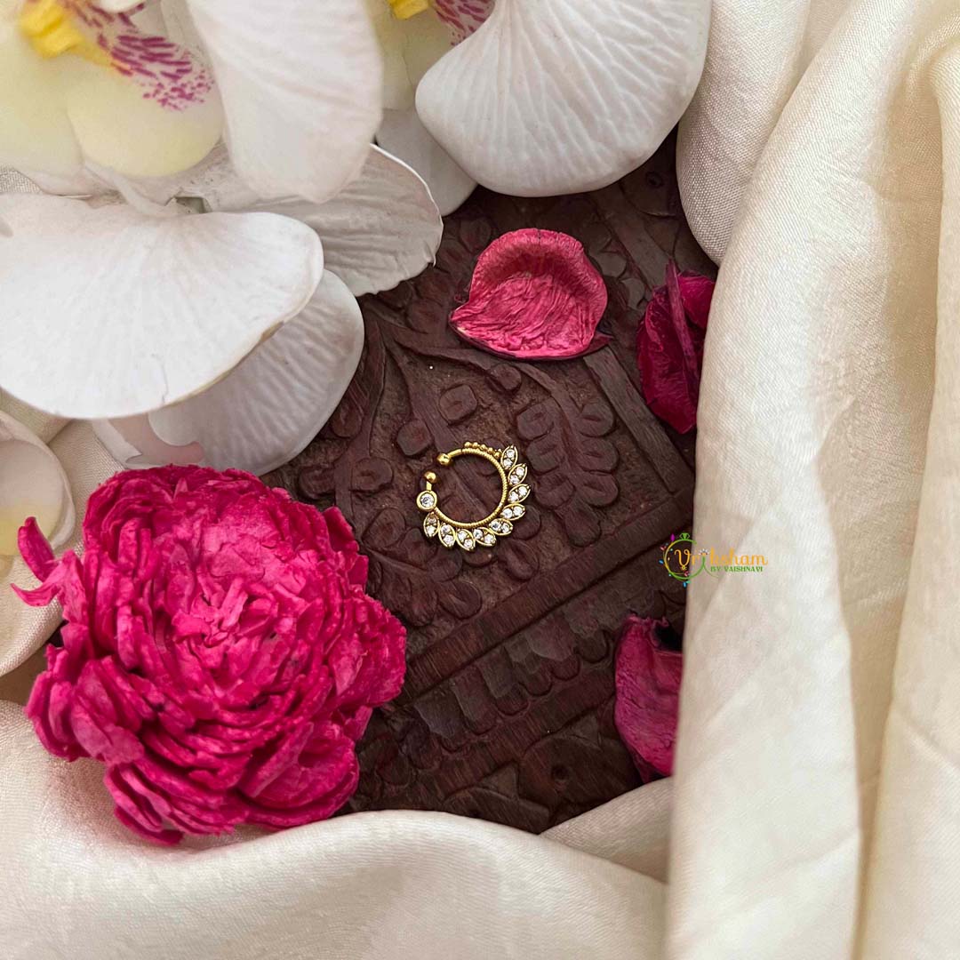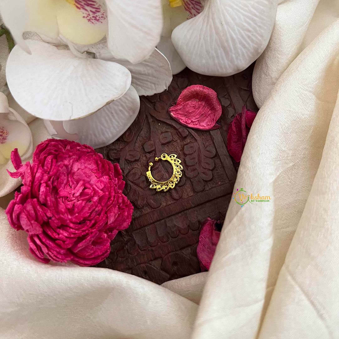 Golden Naths/Nose ring for Non - Pierced Nose. People who do not have piercing do not have to worry about not being able to wear naths. These nose rings helps people with non pierced nose also wear the same with a screw like holding. The moment you see the nath you will be able to understand how it will sit on the nose.