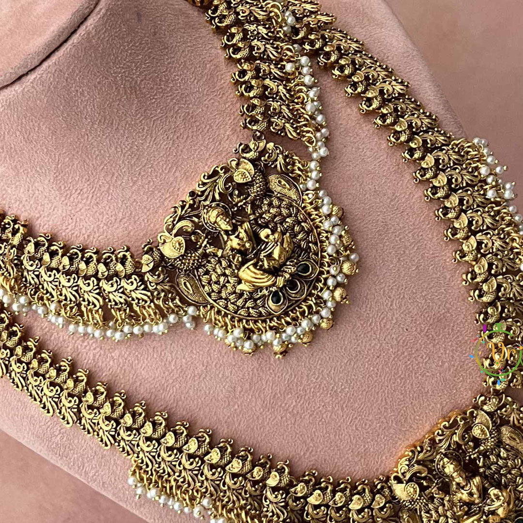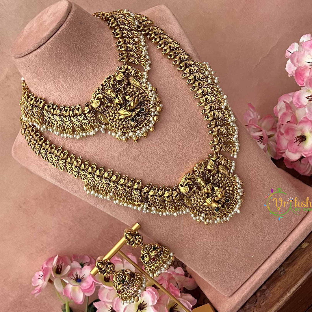 Unveil ethereal beauty with this exquisite bridal set, where delicate peacock feather nakshi designs frame a sacred Lakshmi pendant embellished with lustrous pearls. The intricate feather motifs symbolize grace and elegance, while the pearl detailing adds luminous sophistication to every piece. This collection represents a masterful fusion of ornamental artistry and spiritual symbolism, crafted with meticulous attention to detail. An exceptional choice for brides seeking jewelry that captures the essence of refined femininity, cultural heritage, and timeless radiance in a single, magnificent ensemble.