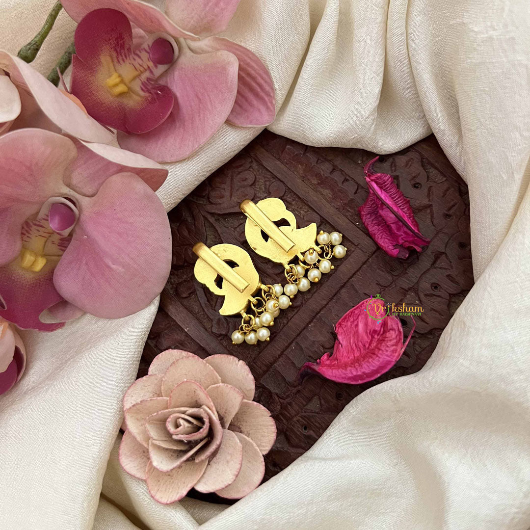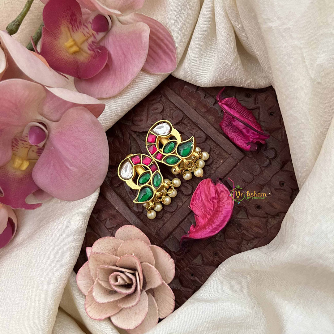 The Vriksham Peacock Feather Style Kundan Jadau Press Bugadi showcases an elegant blend of red, green, and white stones accented by lustrous pearls. Inspired by the graceful peacock feather motif, this sophisticated piece reflects traditional craftsmanship and adds a refined touch to your festive and cultural attire.