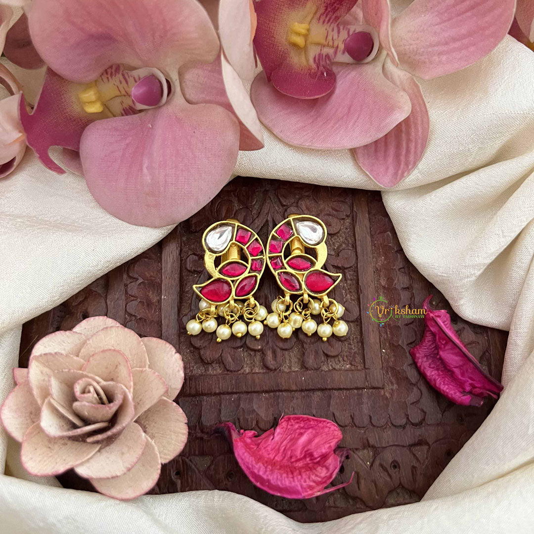 The Vriksham Peacock Feather Style Kundan Jadau Press Bugadi in red and white, adorned with delicate pearls, captures the elegance of traditional craftsmanship. Its refined peacock feather design adds a sophisticated and graceful charm, perfect for enhancing your ethnic ensembles during special occasions.