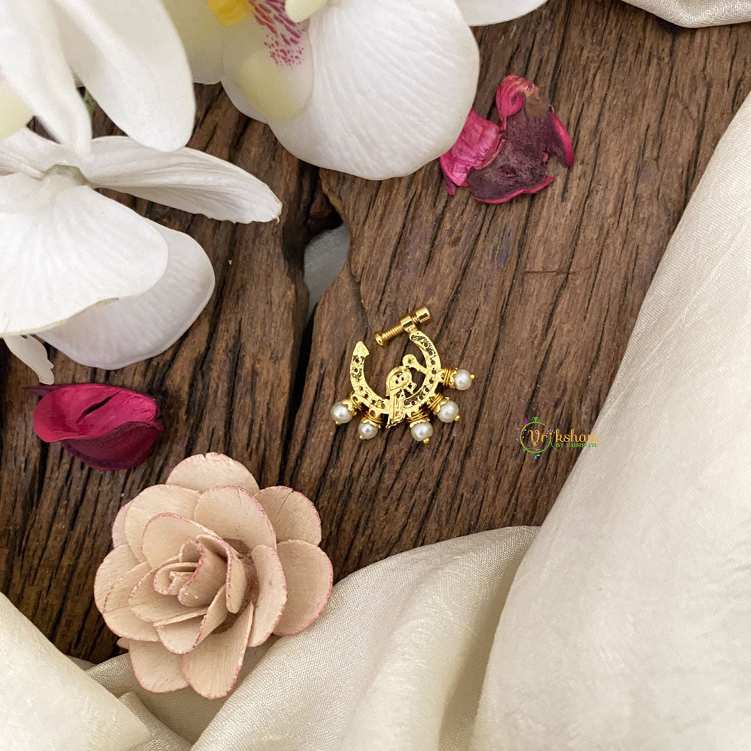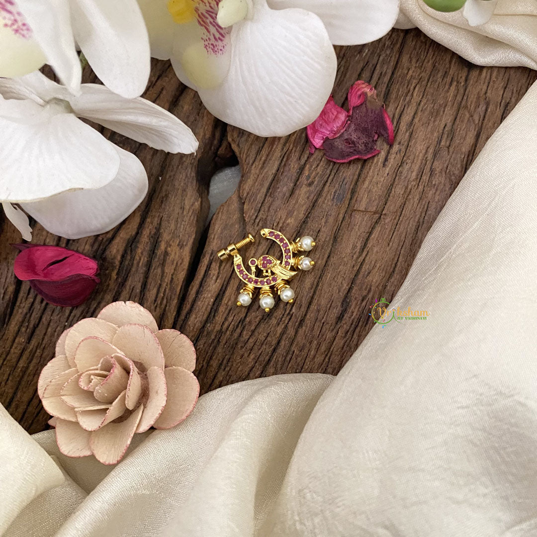 Embrace elegance and luxury with Vriksham's Peacock Golden Naths. This stunning nose pin features delicate pearls accented with red detailing, reminiscent of a peacock's beauty. Elevate your style and exude sophistication with this exclusive piece.