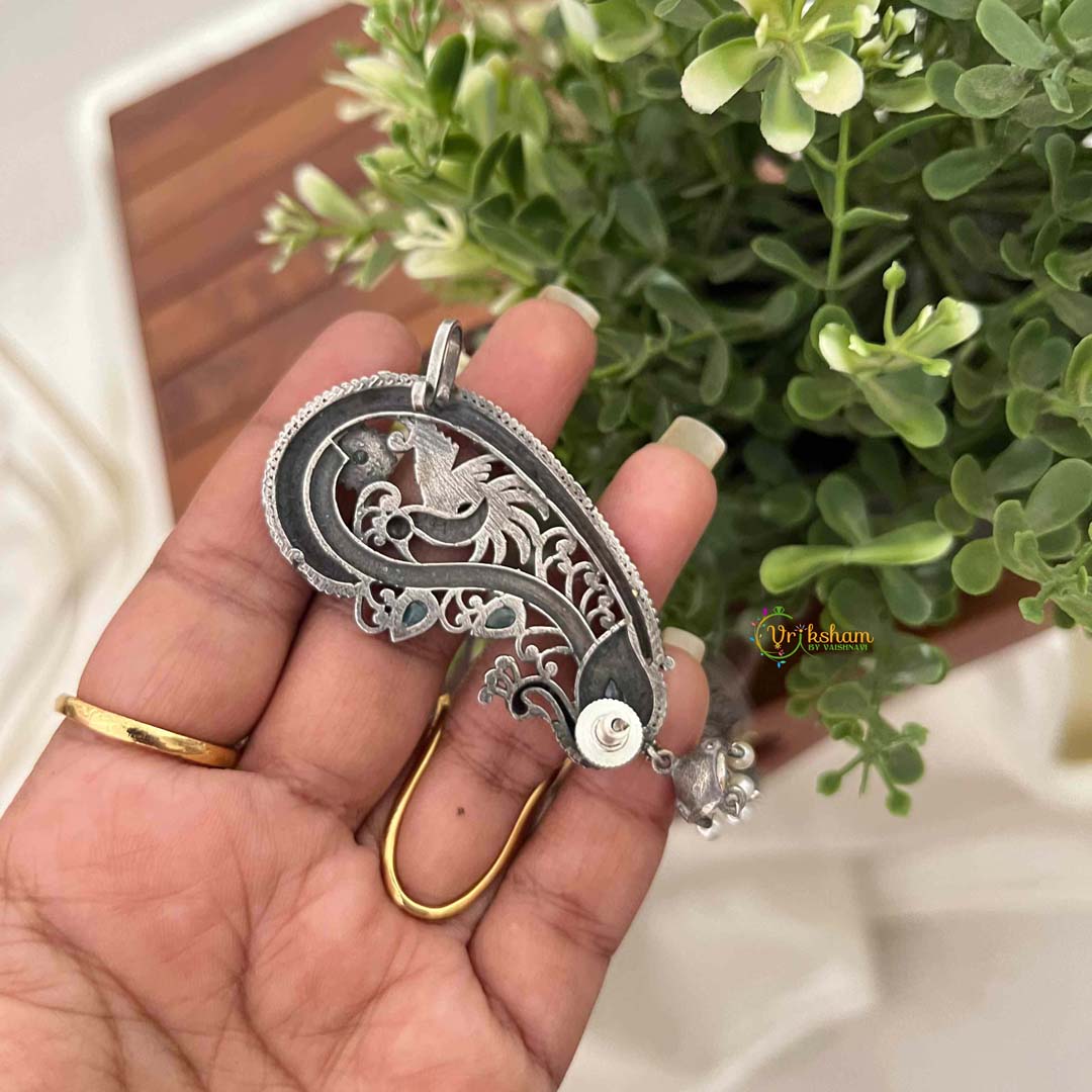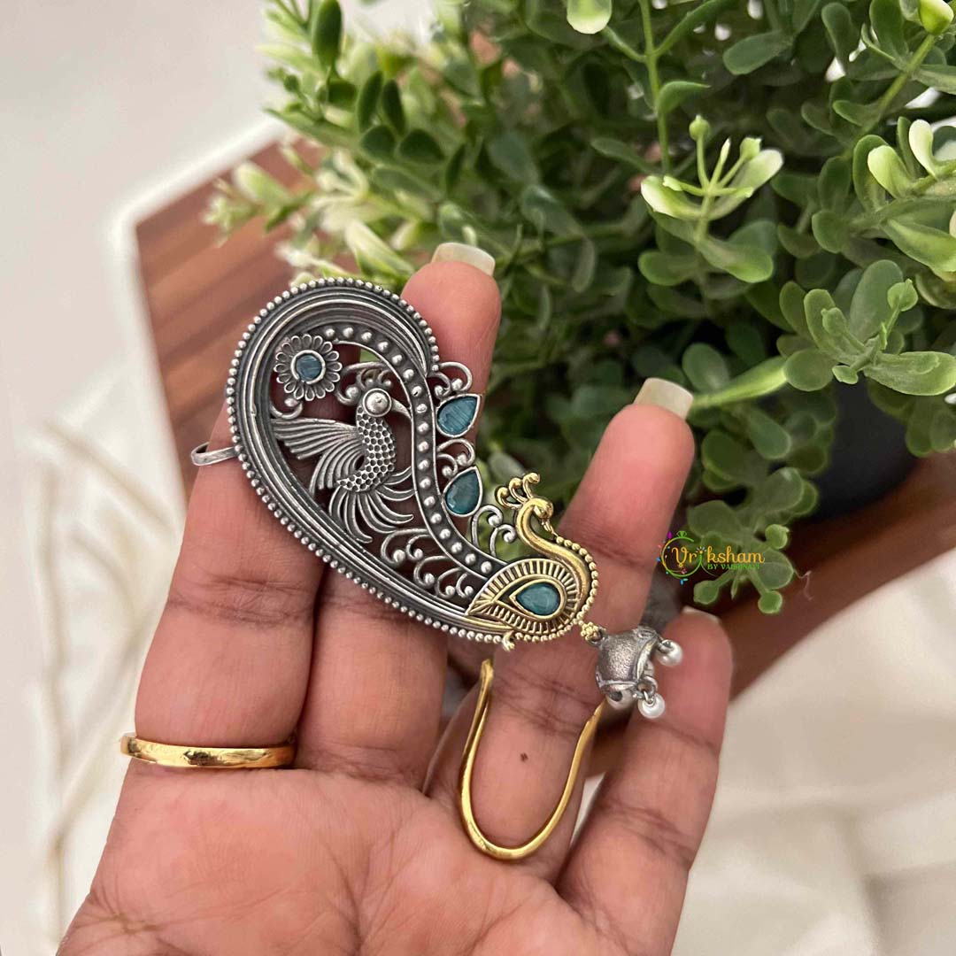 Embrace refined elegance with this stunning dual-tone ear cuff jhumka, where harmonious metalwork frames an exquisite peacock design adorned with serene blue stones. The interplay of dual-tone metals creates dimensional richness and visual sophistication, while the cool-hued gemstones infuse tranquility and grace into the composition. This innovative piece seamlessly blends traditional jhumka artistry with contemporary ear cuff versatility, offering creative styling freedom without piercing requirements. The intricately detailed peacock motif celebrates cultural heritage and symbolic beauty, enhanced by the luminous blue stone accents. Perfect for those who appreciate layered design complexity and bohemian sophistication, this ear cuff transitions effortlessly from casual refinement to elevated occasions, making it an exceptional statement piece for the discerning wearer.