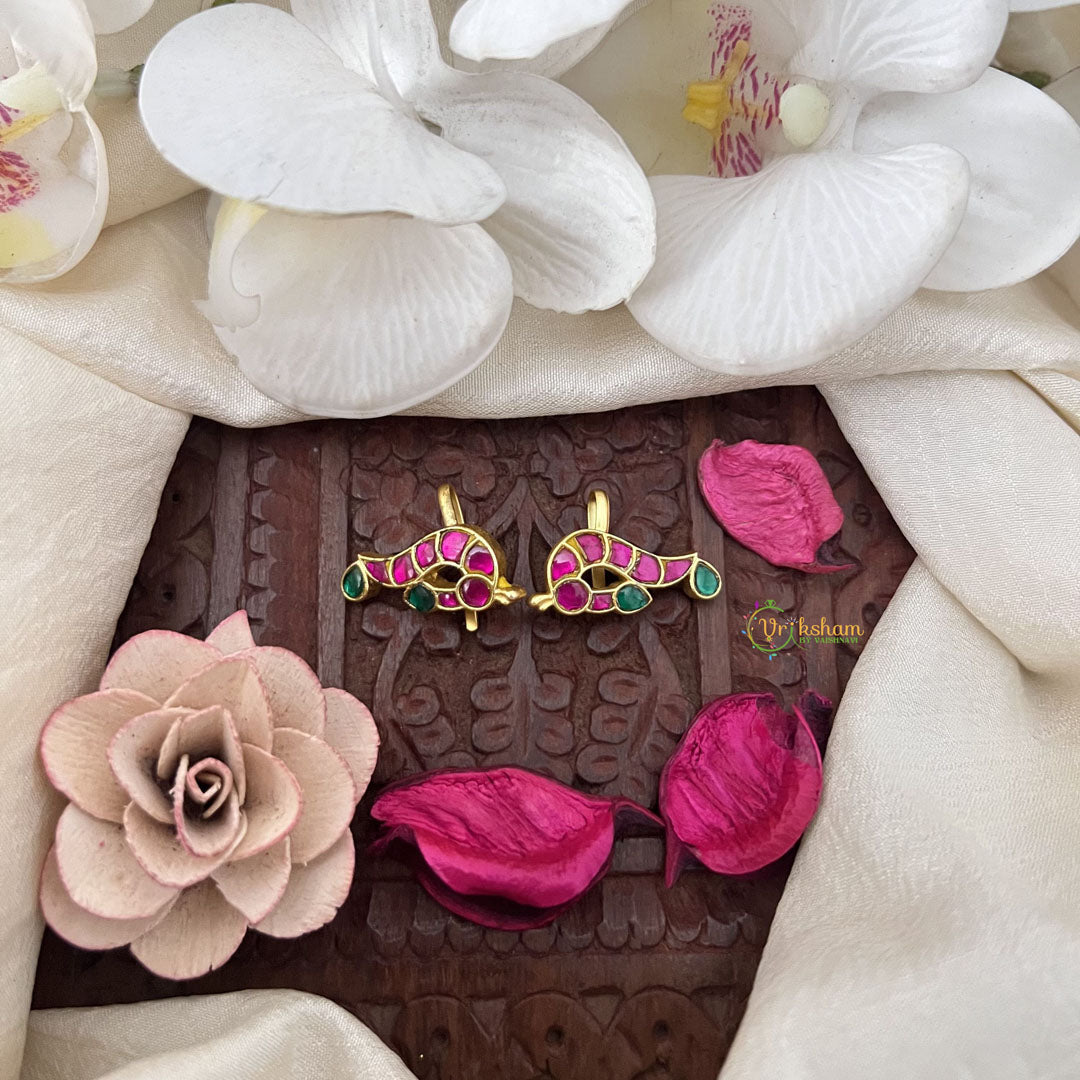 The Vriksham Peacock Grace Kundan Jadau Press Bugadi captures the majestic beauty of the peacock with an intricate design in red, green, and white hues. This sophisticated piece highlights expert Kundan craftsmanship, offering a graceful accessory that adds elegance and cultural richness to any traditional ensemble.